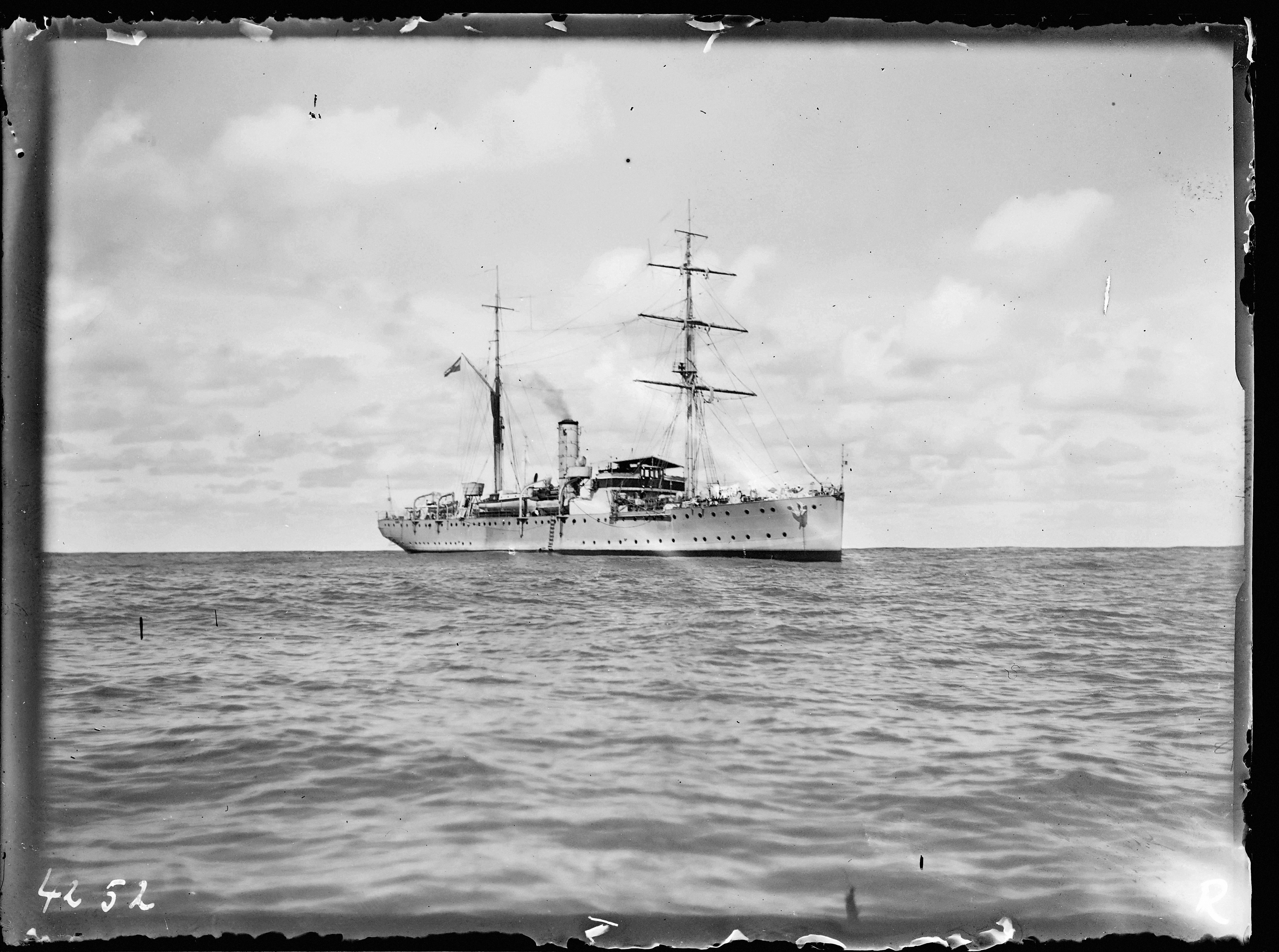 Forschungsschiff METEOR I schräg von vorn, aufgenommen 1926 während der Deutschen Atlantischen Expedition. Sammlung Deutsches Schifffahrtsmuseum. Foto: Otto Freiherr von Recum