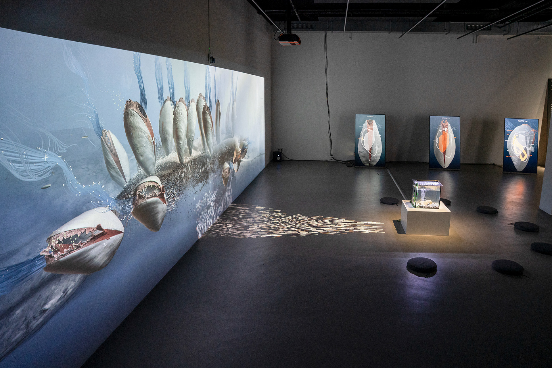 Der Herzschlag von Miesmuscheln steht im Mittelpunkt einer multimedialen Raumerfahrung. Ihre damit einhergehende, sowohl sichtbare als auch spürbare Lebensaktivität stellt unser Verhältnis zu nicht-menschlichen, fremdartigen Lebensformen in Frage. Die interaktive Projektion von Designer Thiemo Frömberg schafft eine berührbare Schnittstelle zwischen dem ungestörten Organismus und dem Menschen, der direkte Konsequenzen seines Handelns erfährt und über die Bedürfnisse von Muscheln und ihre Rolle im Ökosystem informiert wird.