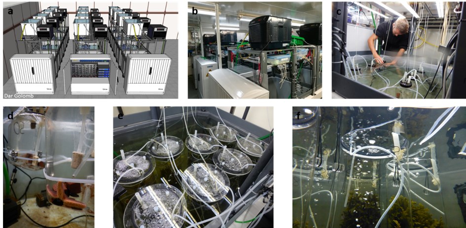 Schematische Übersicht der Kieler Indoor-Bentokosmen (KIBs; a), Übersicht des Klimaraums mit den KIBs (b), Fabian Wolf bei der Arbeit an einem der Tanks (c), Kautex-Flasche als Versuchseinheit mit Asterias rubens (d) und Plexiglaszylinder mit Fucus vesiculosus (e und f). © Dar Golomb (a), Sarah Rühmkorff (c) und Fabian Wolf (b, d–f).
