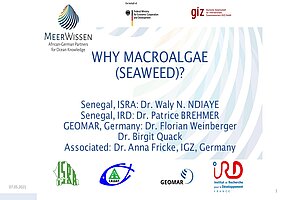 Die internationale Konferenz "Seaweed for blue economies, biodiversity and ecosystem services- and opportunity at sub-regional level" am 6. und 7. Dezember 2022 in Dakar blickte auf das Projekt CLIMALG-SN zurück, präsentierte Ergebnisse der Arbeit und förderte den Austausch mit Initiativen zu Algen im Senegal und den Nachbarländern. Das Programm finden Sie hier und drei Aufzeichnungen (Zoom-Videos) der Präsentation finden Sie unter den folgenden Links Konferenz_6.12.2022_10-12 Uhr, Konferenz_6.12.2022_14-17 Uhr und die Diskussionen am runden Tisch am zweiten Tag Konferenz_Rundtisch_7.12.2022_ 8:30-12:10 Uhr.