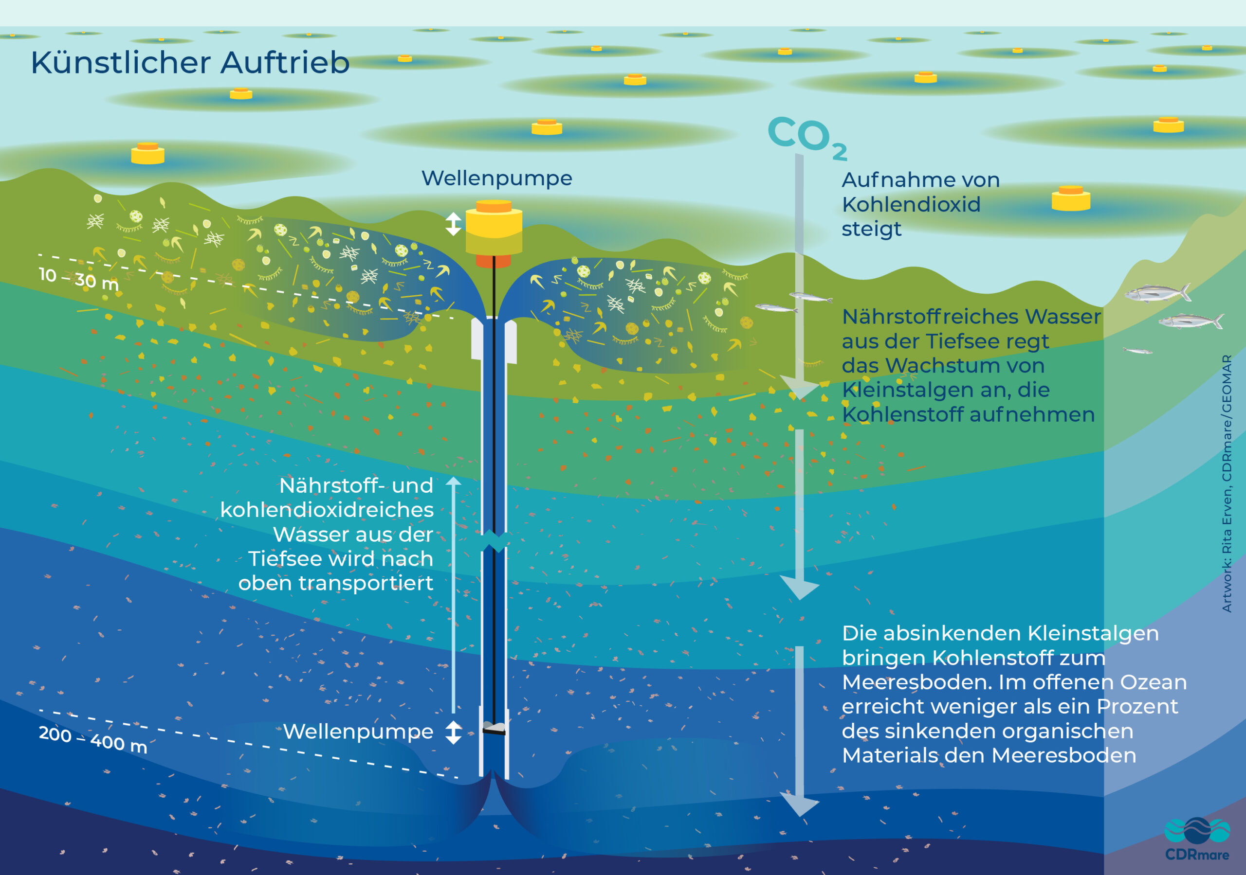 In weiten Teilen des Ozeans ist das Phytoplankton allerdings durch die Verfügbarkeit von Nährstoffen wie Stickstoff, Phosphor und Eisen eingeschränkt. Wenn man den Aufwärtstransport von nährstoffreichem Tiefenwasser durch künstlichen Auftrieb mit Hilfe von Rohren oder Wellenpumpen verstärkt, hat dies eine düngende Wirkung und kann die Gewässer der Ozeanwüsten produktiver machen. Durch das stimulierte Wachstum des Phytoplanktons kann mehr CO2 in dessen Biomasse gebunden werden, was die Kohlenstoffaufnahme des oberen Ozeans erhöht. Wenn das Phytoplankton stirbt und seine Biomasse in die Tiefsee sinkt, kann der gebundene Kohlenstoff in der Tiefe für 100 Jahre und mehr gespeichert werden. Wenn es technisch machbar, ökologisch akzeptabel und wirtschaftlich tragfähig ist, könnte der Einsatz von künstlichem Auftrieb auch für die ökosystembasierte Fischzucht einen wichtigen Beitrag zu einer ökologisch nachhaltigen marinen Aquakultur leisten.