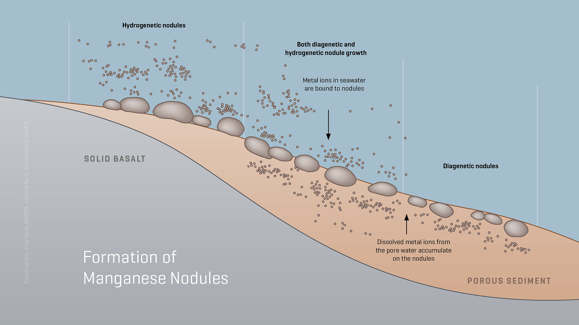 Manganese nodules occur worldwide on the seabed mostly at depths of 3,000 to 6,000 metres. They consist of metals that are transported into the oceans by erosion or originate from hydrothermal vents in volcanically active areas of the oceans. Their growth rate is only a few millimetres in a million years, so larger nodules with a size of 15 centimetres can be up to 15 million years old.