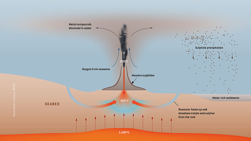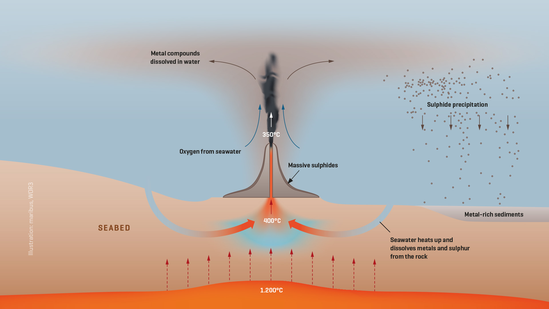 In 1979, the American research submarine Alvin dived into the Pacific Ocean. Through the small portholes of the pressurized hull, the crew saw meter-high chimneys on the seabed at a depth of around 2,600 meters, from which apparently black clouds of smoke were expelled. The scientists had discovered the first hydrothermal vents, so-called “Black Smokers”. Investigations showed that minerals were deposited around the springs, forming deposits of so-called massive sulphides. In the meantime, more than 410 occurrences are known in all oceans, although there are enormous differences in the size of these features. Hydrothermal vents are not only a source of raw materials, but also an extraordinary habitat.