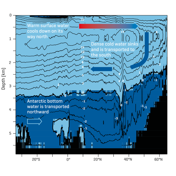 One of the flagships among the ocean dynamics models is the high-resolution Atlantic model VIKING20X. In this model, velocities, temperatures and salinity are simulated in a three-dimensional grid with a mesh size of a few kilometres in the horizontal and 46 depth layers in the vertical over periods of the last 60 years. The Atlantic overturning circulation is one of the crucial core variables for understanding the ocean and its effects on climate and climate variability. It is calculated from the totality of ocean currents and indicates the strength of warm water masses flowing northwards at the surface and cold water masses flowing southwards at depth.