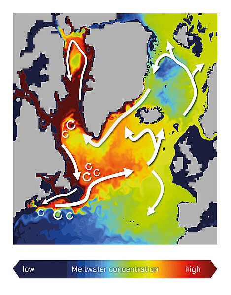 Studies conducted at GEOMAR indicate that the influence on ocean circulation has been underestimated in current climate models. In contrast to high-resolution simulations, the latter do not explicitly represent mesoscale ocean eddies from 10 to 100 kilometres. However, these eddies have a considerable influence on the circulation and distribution of meltwater. Thus, in model studies, a weakening of the heat pump and considerable cooling in the North Atlantic region occurs after only a few decades of massive melting.