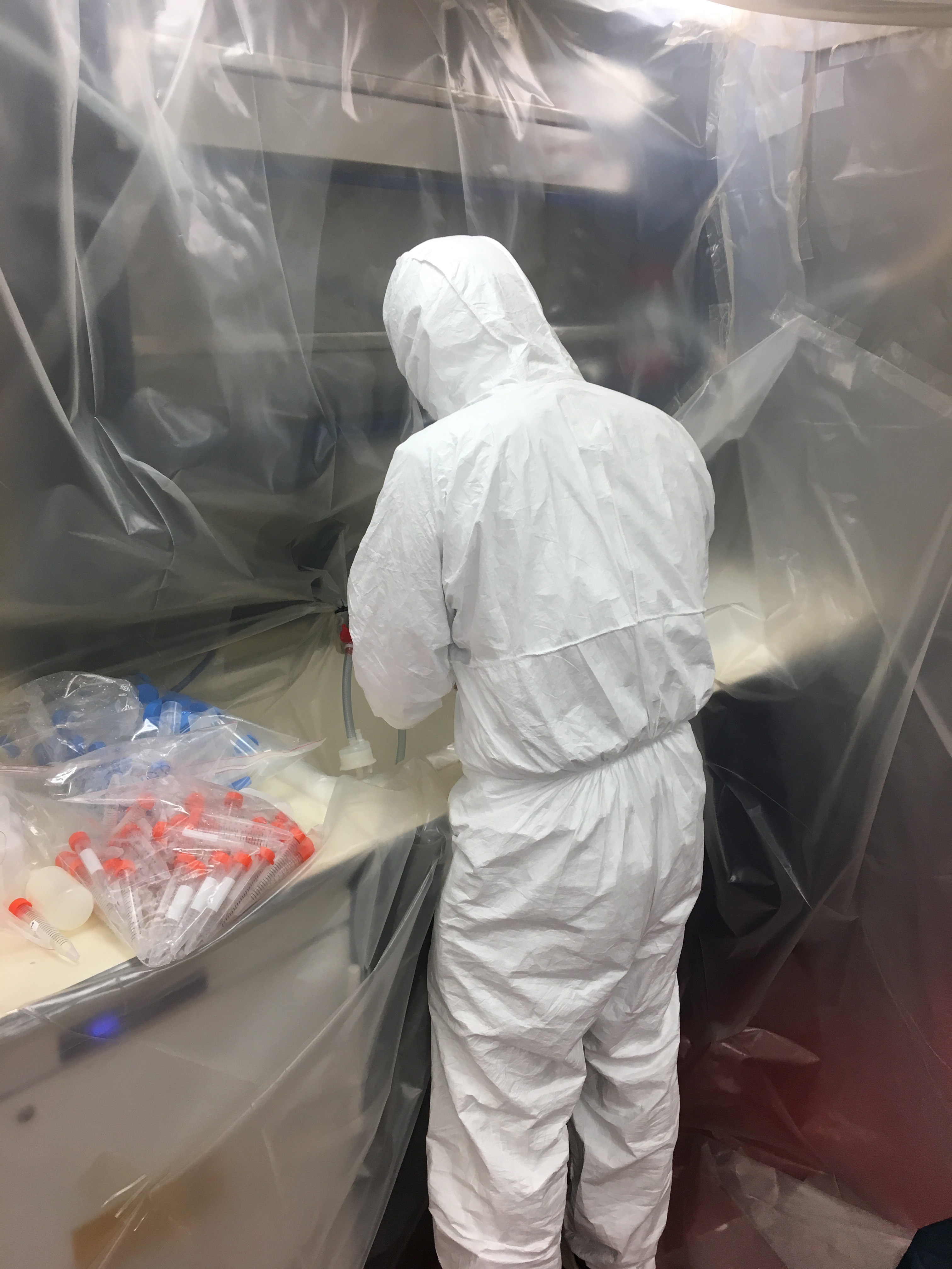 Samples for the determination of the iron concentration in seawater are taken under trace metal-pure conditions in the laboratory on board the research vessel SONNE. Photo: Tom Browning, GEOMAR