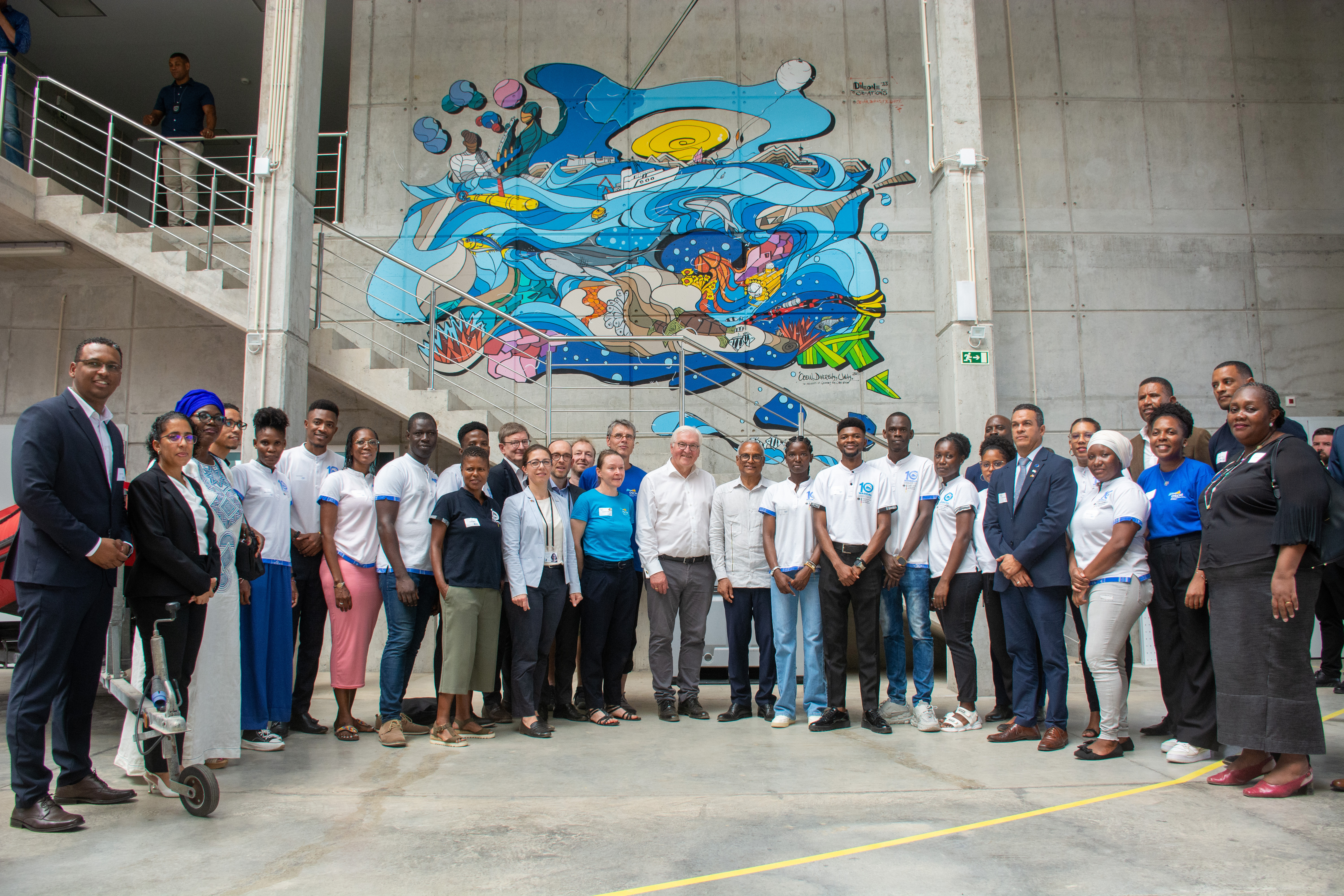 During their visit to the Ocean Science Centre Mindelo, German Federal President Frank-Walter Steinmeier and José Maria Neves, President of the Republic of Cabo Verde, (centre) inaugurated a mural by Cape Verdean artist David Leone Lima Monteiro. Photo: Edson Silva Delgado, GEOMAR