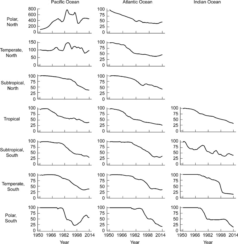 Palomares, M. L. D., R. Froese, B. Derrick, J.J. Meeuwig, S.-L. Nöel, G. Tsui, J. Woroniak, D. Zeller, D. Pauly (2020): Fishery biomass trends of exploited fish populations in marine ecoregions, climatic zones and ocean basins. Estuarine, Coastal and Shelf Science, https://doi.org/10.1016/j.ecss.2020.106896
