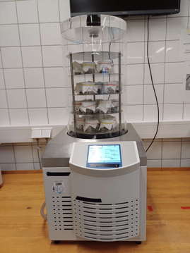The beakers with the frozen samples are covered with a lint-free wipe and exposed to a high vacuum in the lyophilizer. The resublimated water is bound in a cold trap at -60 degrees. Freeze drying takes more than 24 hours. The samples retain their shape and color. After freeze drying, the samples are riddled with numerous microscopic cracks that run around larger components. The salt from the pore water remains in these cavities as tiny crystals or crusts. If freeze-dried samples are covered with distilled water, the sediment breaks down into small scales in just a few moments and can be washed easily and quickly without wasting a lot of water.