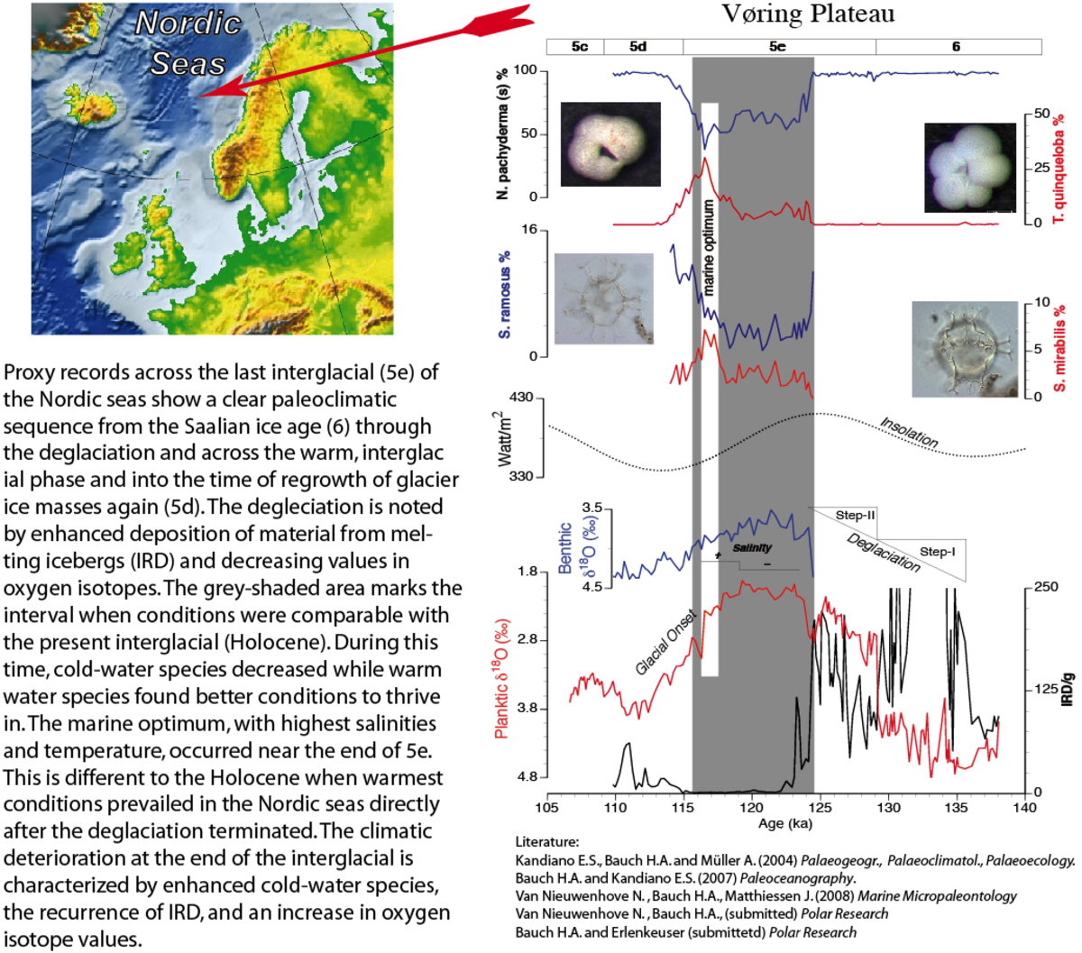 The LIONS project is funded by the DFG. It focuses on the last interglacial (Marine Oxygen Isotope Stage or MIS) 5e) of the Nordic Seas, i.e., the Norwegian, Island and Greenland Sea. The area has a high responsiveness to climatic changes, and because temperatures during MIS 5e are believed to have been at least as high as today, paleoceanographic reconstructions thus could provide insight in possible future climate development.