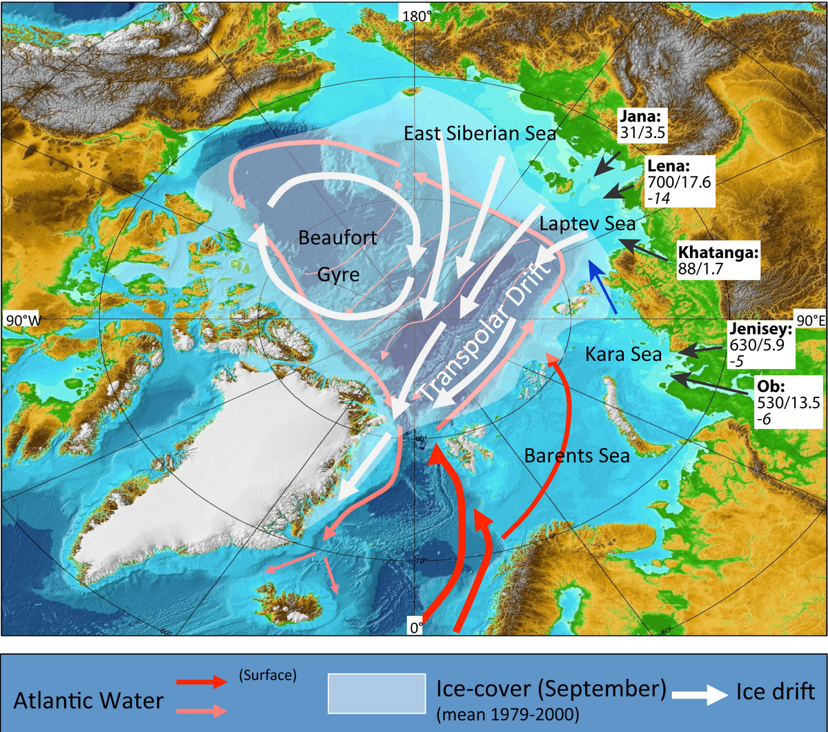 Subproject 1a focuses on changes in water mass and matter transport within the Transpolar System from the Siberian inflow in the Laptev Sea to the surface outflow area in the Fram Strait. To study the impact of these changes on water mass exchange processes in the Fram Strait on the one hand and on the abiotic factors in the sensitive Siberian ecosystem on the other, the distribution of radiogenic neodymium isotope ratios and Rare Earth Elements in seawater (Nd; see Factsheet) will be examined in combination with the variability of horizontal and vertical matter fluxes (see Factsheet). The results of detailed summer measurement campaigns in the Fram Strait and on the Laptev Sea shelf will be linked to long-term observational data in the Laptev Sea. For this purpose, seafloor observatories were deployed for a one-year period during TRANSDRIFT XXI expedition in 2013. They were recovered successfully during TRANSDRIFT XXII in 2014 and recorded oceanographic (temperature, salinity, currents) and optical (turbidity, acoustic backscatter, see Factsheet ADCP) data on the inflow and outflow of the Transpolar System on the Laptev Sea shelf.