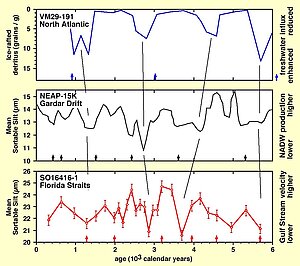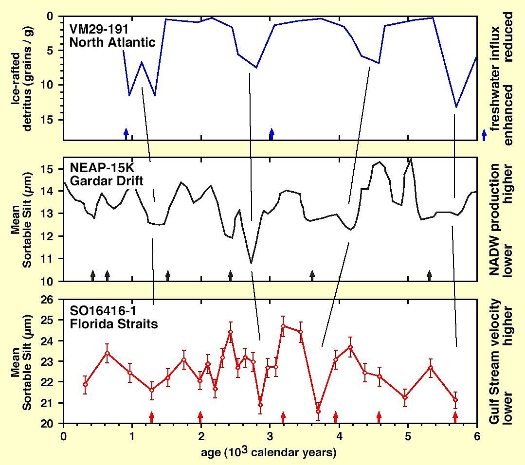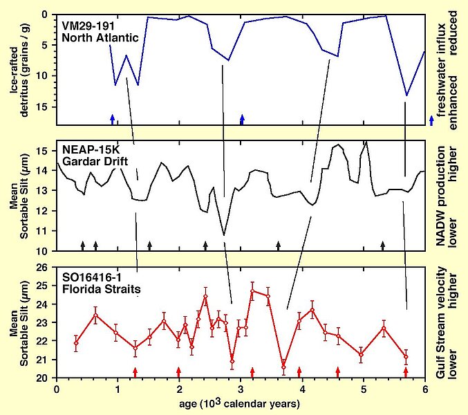 The linkage between Gulf Stream intensity and high northern latitude climate is studied in the RASTA and GOLDFLOSS Projects. Ice-rafting and freshwater influx in the North Atlantic persisted with a millenial cyclicity during the late Holocene (Bond et al. 1997). Periods with higher freshwater influx correspond to lower Iceland-Scotland Overflow (ISOW) strength and thus North Atlantic Deep Water (NADW) production as depicted by a Mean Sortable Silt record (10 to 63 µm) from Gardar Drift to the south of Iceland (Bianchi and McCave, 1999). Periods of lower (NADW) production are mirrored by sortable silt minima in Florida Straits' core SO16416-1 inferring a less intense Florida Current and Gulf Stream at these times (Lund and Curry, 2004; Schönfeld et al., 2004). Error bars: standard error (±2 %) for Sortable Silt. Arrows:14C datings. Note that the records may slightly lag each other within the framework of radiocarbon datings.