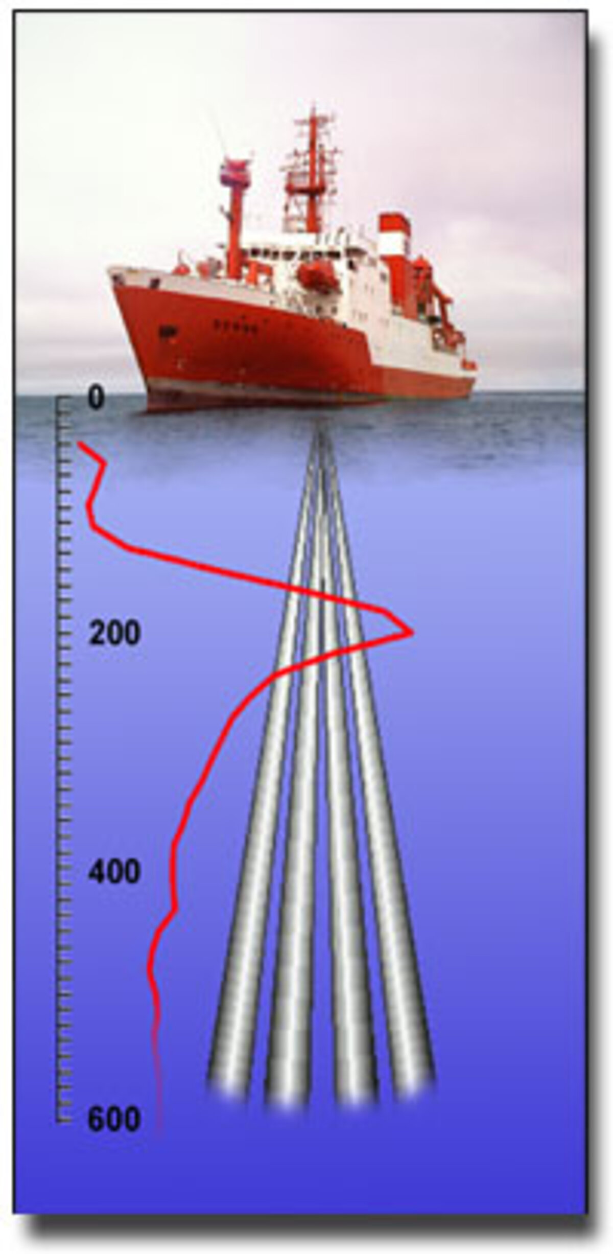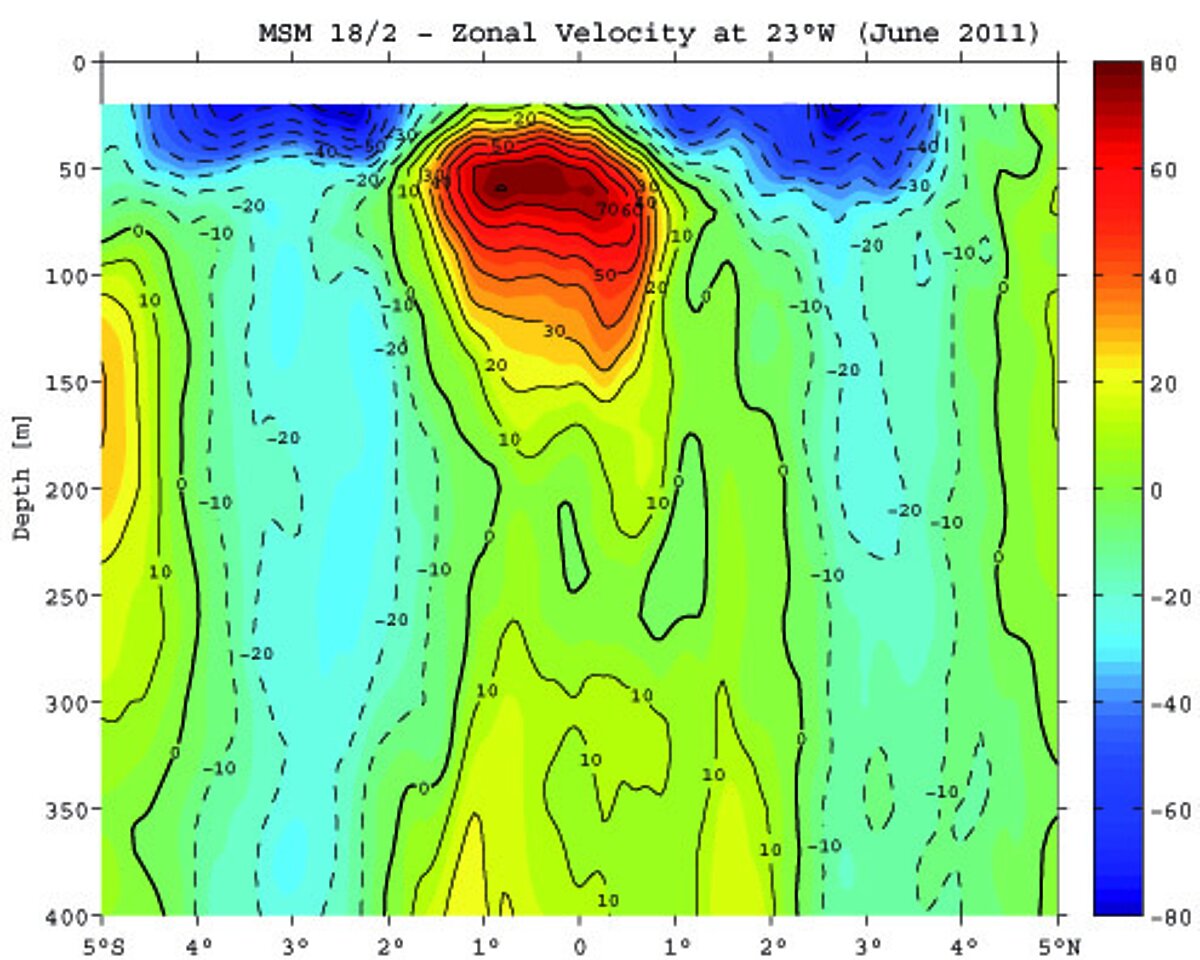 Nowadays, most current measurements are taken acoustically, i.e. by using the so-called Doppler effect: The frequency of a reflected acoustic signal changes as the target (or reflector) moves relative to the sound source (transponder). This phenomenon is well known as the sound of a passing car changes when it moves past the observer. The transponder of the ADCP sends out a sound wave with a well-defined frequency. This wave is reflected by particles moving with the water flow. The travel time of the reflected sound wave is indicative of the distance from the transducer, i.e. the depth. The frequency shift is indicative of the particle or water speed. An ADCP (Acoustic Doppler Current Profiler) can then provide vertical profiles of horizontal currents of up to 1600m deep.