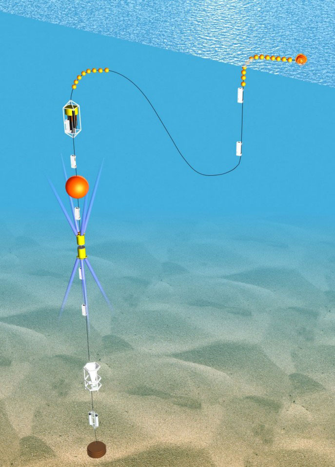 A mooring describes a measurement platform with autonomously registering sensors at various depths where the entire platform is “moored” at a fixed location by a bottom weight (often made of discarded railroad wheels). The mooring consists of steel wire or synthetic rope which holds the sensors plus associated buoys made of glass or foam to provide sufficient buoyancy to keep the mooring upright.