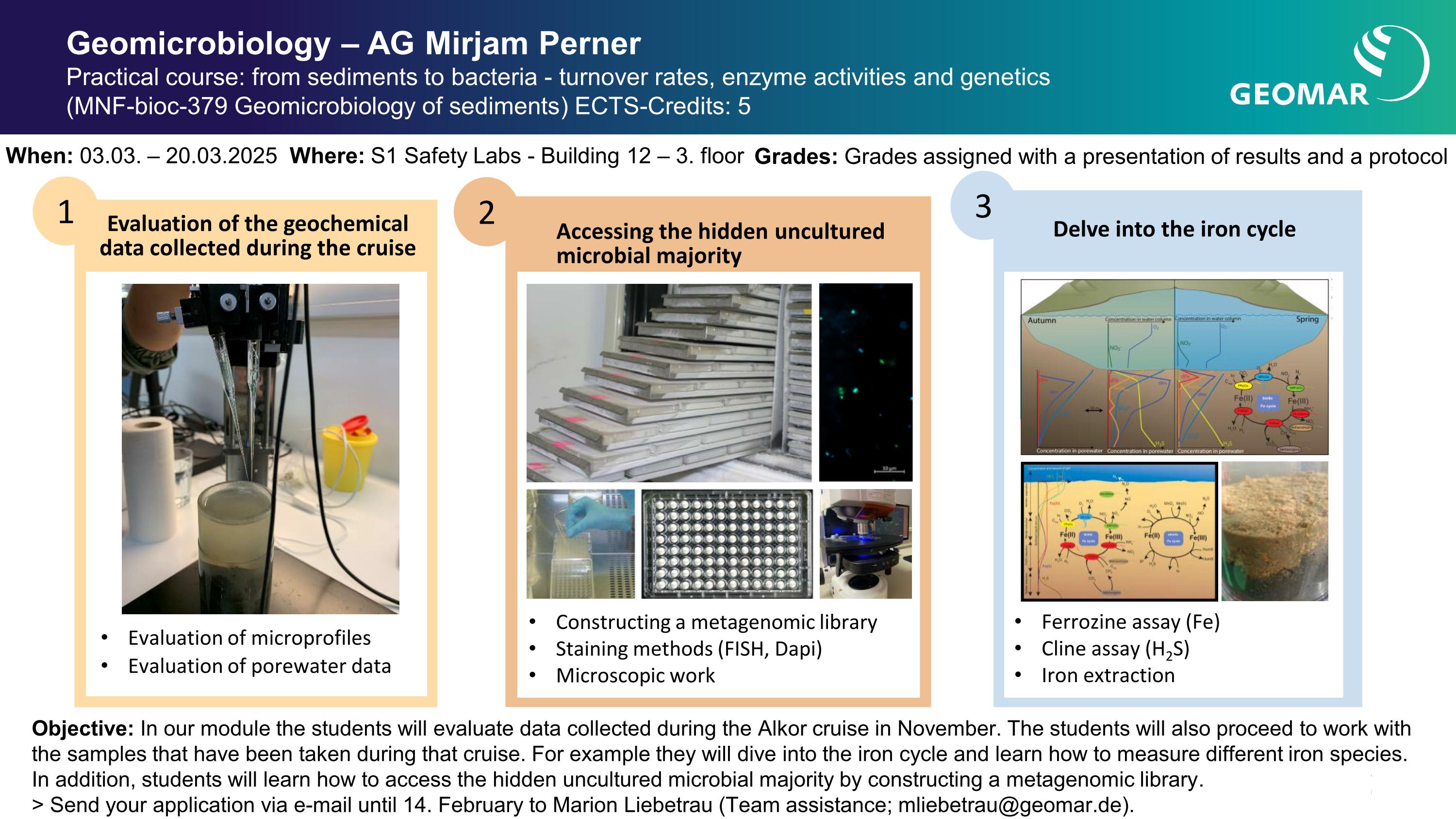 In this module the students will evaluate data collected during the students Alkor cruise in November. The students will also proceed to work with the samples that have been taken during that cruise. For example they will dive into the iron cycle and learn how to measure different iron species. In addition, students will learn how to access the hidden uncultured microbial majority by constructing a metagenomic library.