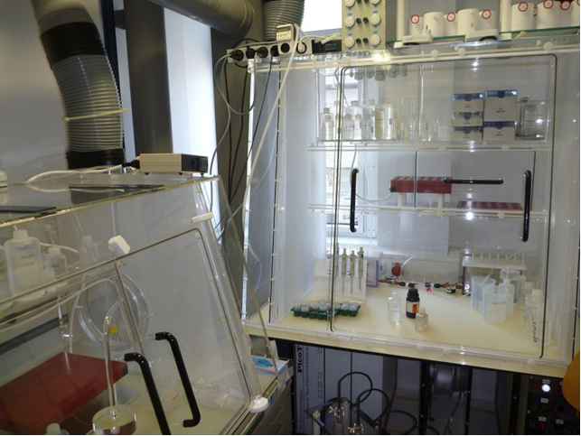The clean-lab has two rooms and an entrance hall. It is furnished with clean air through H14 filters. The air pressure is slightly higher than the normal pressure to avoid contaminations.