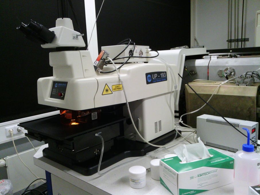 Being part of the AXIOM lab the Laser Ablation unit (ESI NWR UP193fx) was installed in 2006. Its excimer source provides short (~3 ns) pulses of 193nm laser radiation which is used to ablate material from solid samples at spatial resolutions between 1-150 µm. The ablation chamber used (ESI NWR LFC) is capable to house samples as large as 15cm x 15cm x 2cm. Ablated material is transported by He cell gas (mixed with Ar prior to injection into the ICP). The sample aerosol is transferred to the MC-ICP-MS AXIOM and directly measured for isotopic composition.