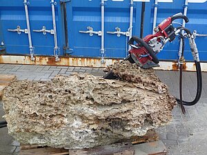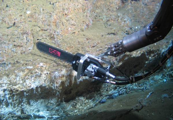 A hydraulic driven, water cooled diamond chain saw with varying blade length of up to 1 m for profile cuts and formatting of large sample blocks. Implemented into the GEOMAR ROV Kiel 6000 system well targeted underwater sampling (“seafloor surgery”) is already conducted successfully down to 1000 m depth.