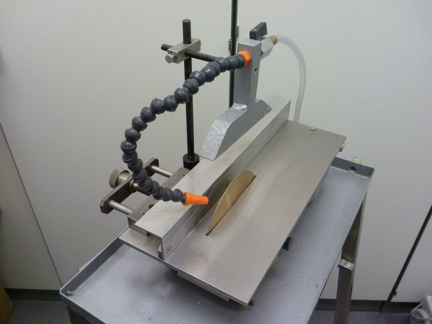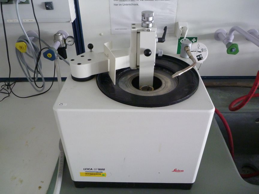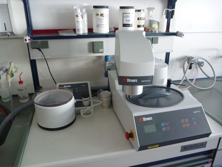 For “non-destructive” EMP (Electron-Micro-Probe) and SIMS (Secondary Ion Mass Spectrometer) analyses flat and highly polished sample surfaces are required. For these usually small sample series we apply an adequate vacuum embedding device (e.g. for porous foraminifera) and polishing system, specialized on surface quality and less suitable for thin-section preparation routines.