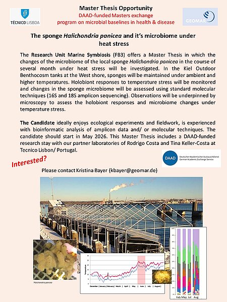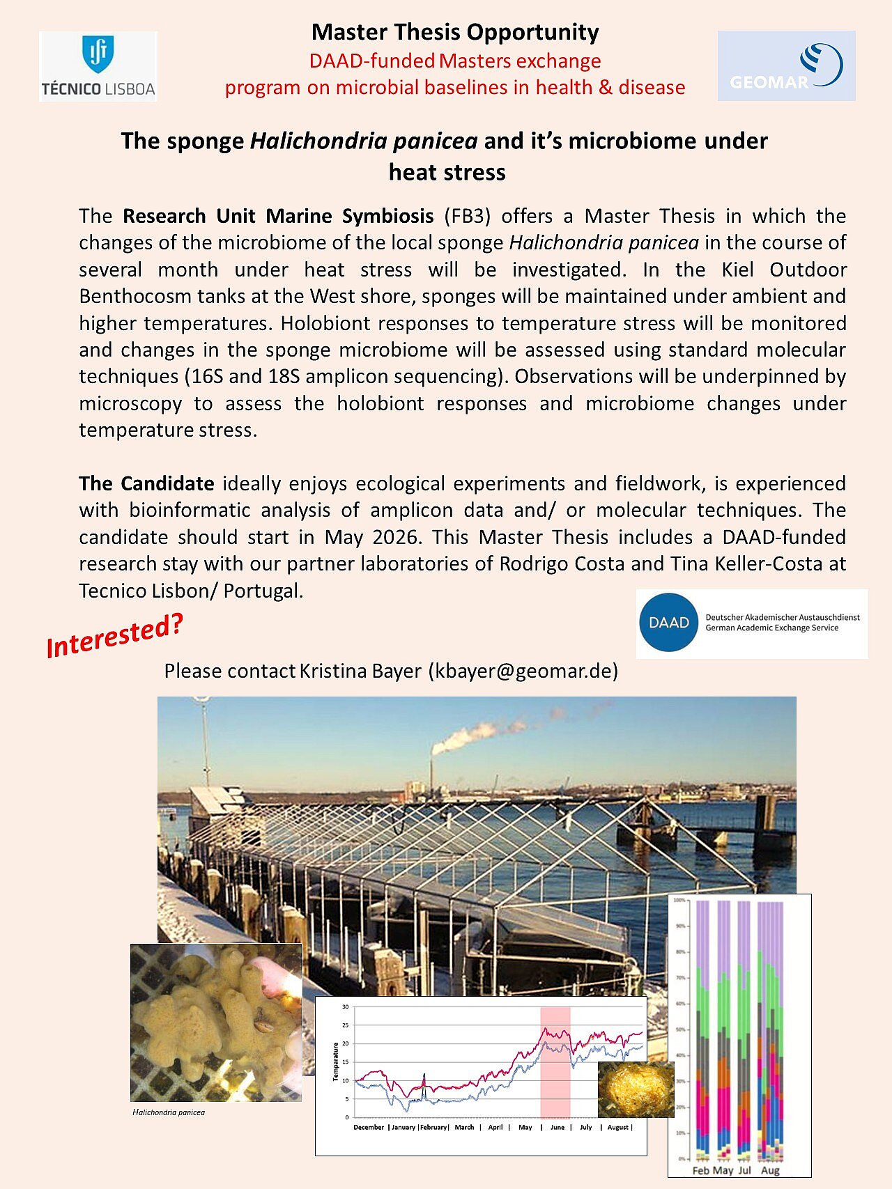 The Research Unit Marine Symbiosis (RD3) offers a Master Thesis in which the changes of the microbiome of the local sponge Halichondria panicea in the course of several month under heat stress will be investigated. Holobiont responses to temperature stress will be monitored and changes in the sponge microbiome will be assessed using standard molecular techniques (16S and 18S amplicon sequencing). Observations will be underpinned by microscopy to assess the holobiont responses and microbiome changes under temperature stress.
