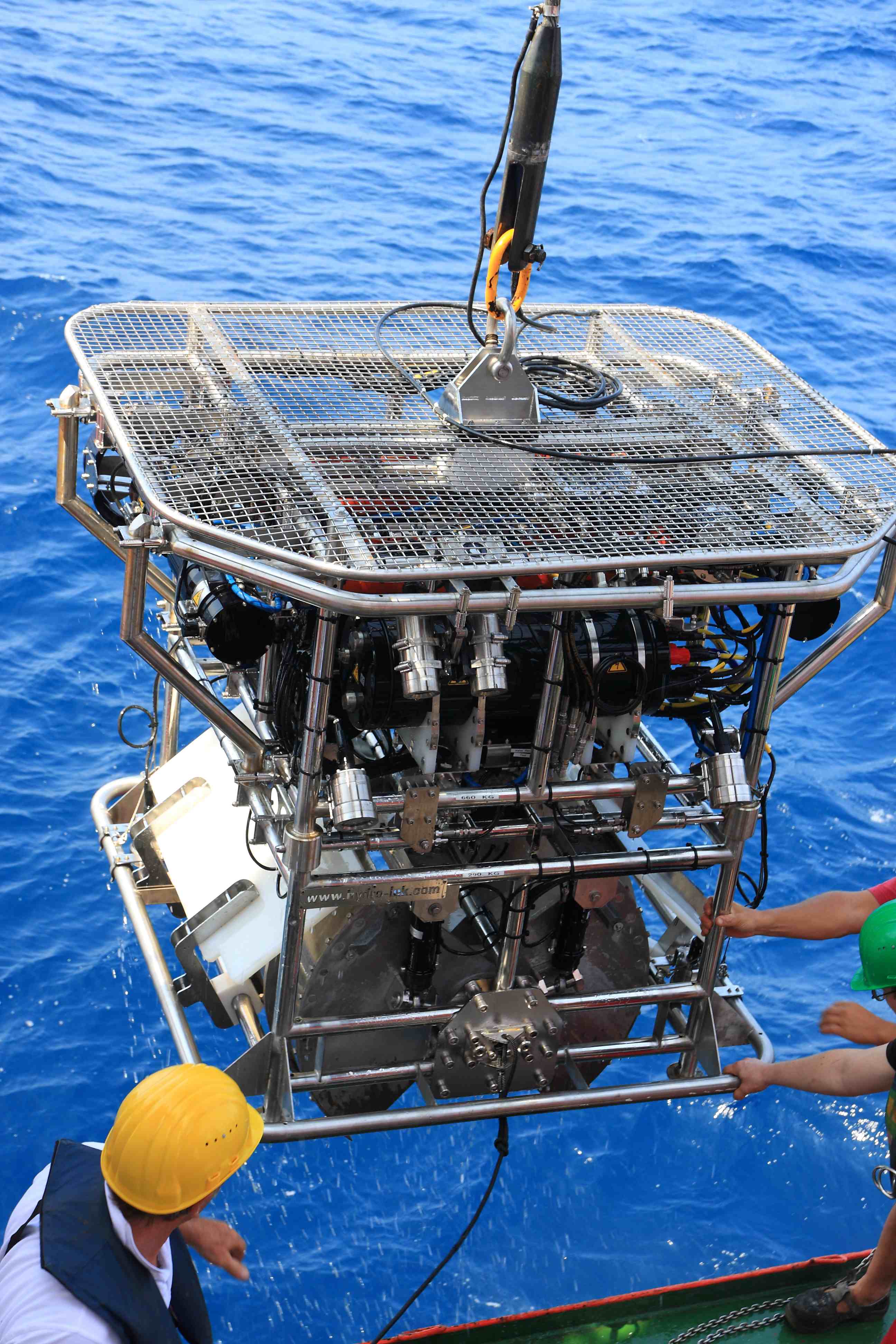 HyBis is a multi-purpose robotic underwater vehicle (RUV), which is controlled by a fiber optical cable and is equipped with a sampling grab. HyBis was developed by the National Oceanography Centre in Southampton (NOCS) and Hydro-Lek Ltd and can dive up to a depth of 6000 metres. GEOMAR’s HyBis is the second instrument after the prototype, which is operated by NOCS. Both vehicles were frequently used on numerous research cruises and contributed for example to the investigation of the deepest known hydrothermal systems in the world in the Cayman Trough (Caribbean Sea) in approximately 5100 metres water depth.