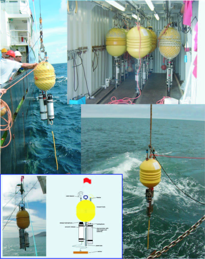 Underneath the buoyant body the acoustic release (iXblue or K.U.M.) and the 0.8 m long pressure tube with the data logger (own development GEOLOG or 6D6 by KUM) and its batteries (up to 72 R20 or lithium cells) are mounted. The hydrophone (HTI-04 / HTI-90) is mounted between the acoustic release and the pressure cylinder. The acoustic release has its own power supply and an additional time release programmable for safety reasons.