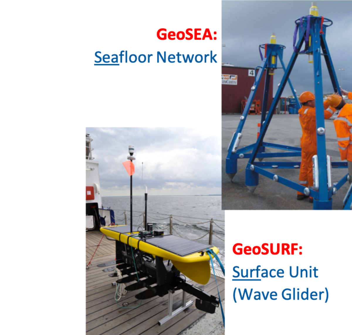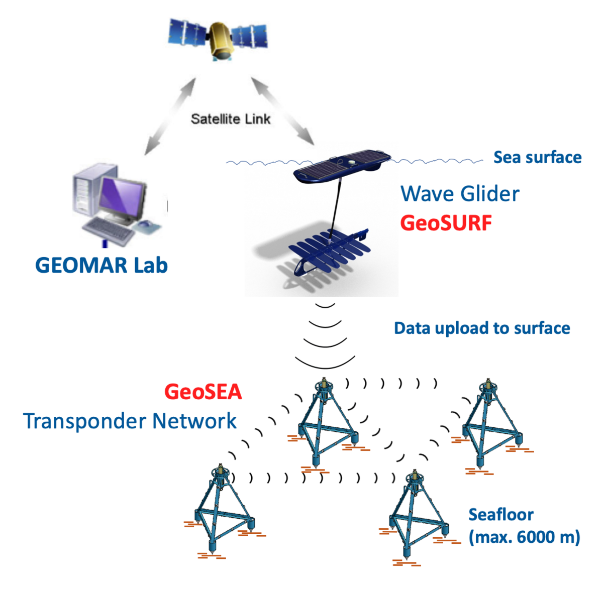 The GeoSEA (Geodetic Earthquake Observatory on the Seafloor) Array is an autonomous, mobile network of seafloor mounted stations that detect any active deformation of the underlaying seafloor. The GeoSEA network consists of two major, independent components: 1. GeoSURF, the Surface unit and 2. GeoSEA, the actual Seafloor Network, a network of transponders at the seafloor (Fig. 1 and 2).