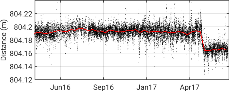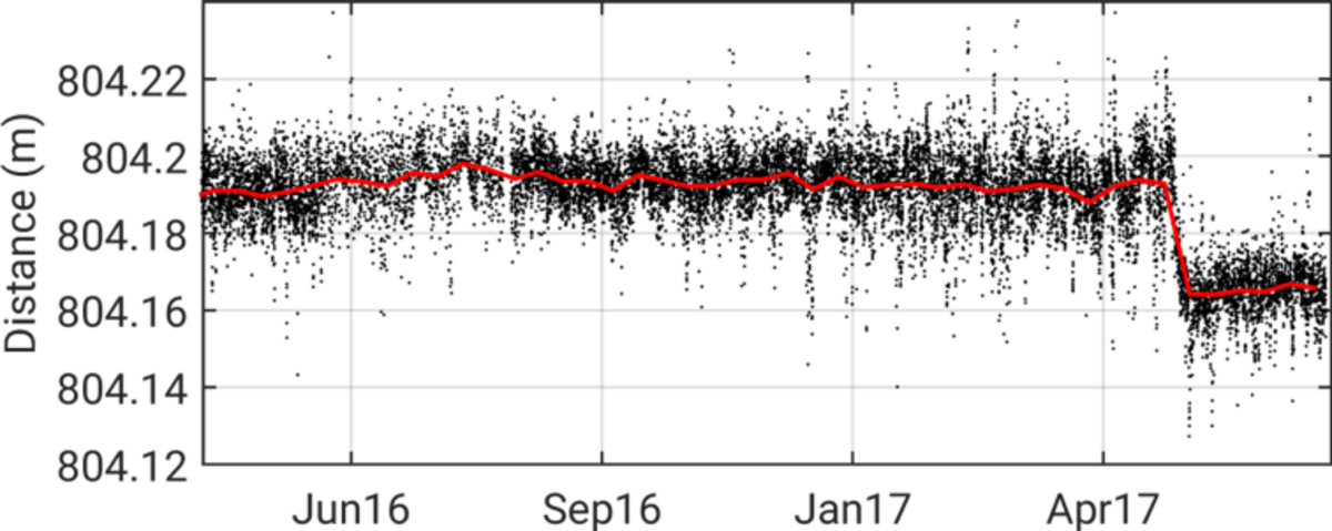 Thus, the system can not only measure horizontal distances, determined acoustically with guarantied sub-cm accuracy over distances of 2 km, but also vertical distances with the help of integrated pressure sensors. The measured vertical and horizontal high accuracy distances can easily be translated into deformation, making the device ideal for tectonic studies.
