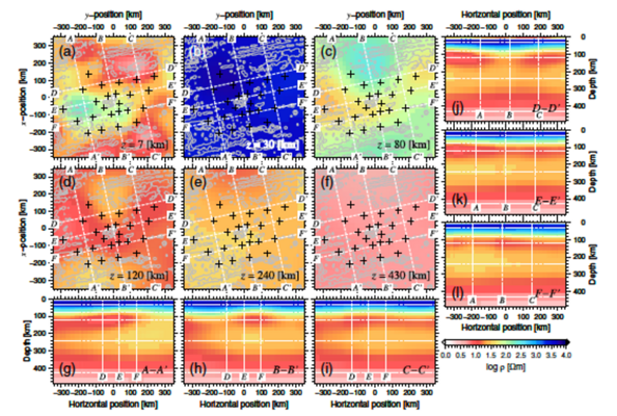 Electrical resistivity in the crust and mantle are a function of porosity and water content in the upper crust and temperature, melt fraction and chemical composition (i.e. hydration) in the mantle.