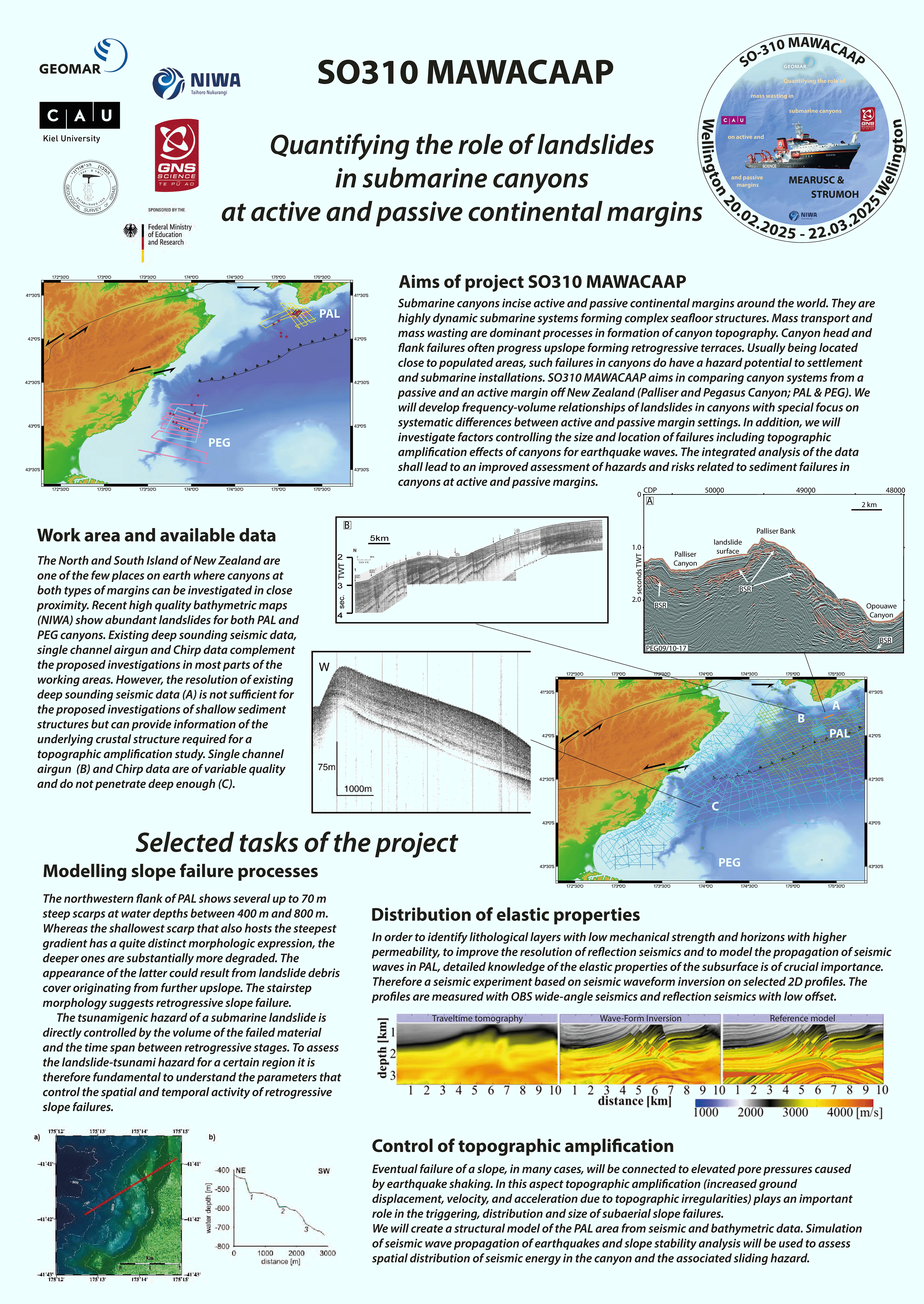 Submarine canyons incise active and passive continental margins around the world. They are highly dynamic submarine systems forming complex seafloor structures. Turbidity currents and mass wasting are dominant processes in formation of canyon topography. Canyon head and flank failures often progress upslope forming retrogressive terraces. Usually being located close to populated areas, such failures in canyons do have a hazard potential to settlement and submarine installations. Canyons have been investigated in active and passive margin settings but direct comparisons based on field data are rare. The MAWACAAP joint project in New Zealand uses the spatial proximity of Palliser Canyon, in the area of influence of subduction on the Hikurandi continental margin, and Pegasus Canyon, away from the subduction zone, for such a comparison. We propose to develop frequency-volume relationships of landslides in canyons with special focus on systematic differences between active and passive margin settings. In addition, we will investigate factors controlling the size and location of failures including topographic amplification effects of canyons for earthquake waves. The integrated analysis of the data shall lead to an improved assessment of hazards and risks related to sediment failures in canyons at active and passive margins.