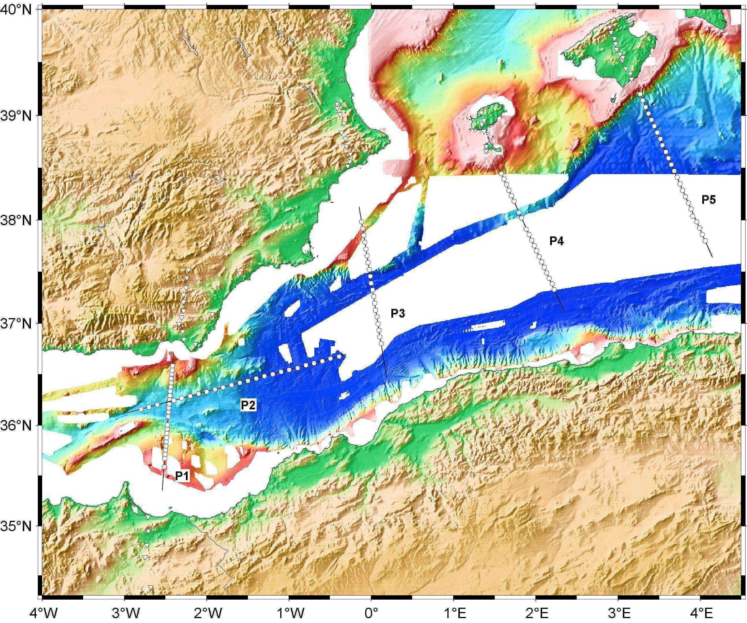 The Western Mediterranean is a natural laboratory to study the processes of continental extension and rifting in a convergent setting. Gravitational collapse due to tectonic thickening of continental lithosphere and the rollback of an oceanic slab during the latest phases of consumption of the Tethys oceanic lithosphere have led to rapid Neogene extension in an area characterized by a constant convergence of the African and European Plates since Cretaceous time. The current setting displays a complex array of tectonic units that may be characteristic of the stage previous to a large scale continent-continent collision and that may include the lithospheric terranes that will eventually be emplaced along an orogenic belt. However, little is known about the crustal and upper mantle structure of much of the area and about the mechanisms of extension that have controlled the formation of the continental margins. Scientists believe, though, that the Ligurian Sea and the deep sea basin to the south of the Balearic Islands (Algerian Basin) is either floored by Neogene oceanic crust or perhaps by exhumed continental mantle, while the Alboran Sea and the transition from the south-Balearic margin into the basins are suggested to be characterized by streched continental crust. The understanding of the formation mechanisms and the evolution of the continental margins of the Western Mediterranean has been hampered by the lack of modern geophysical data. During M69/2 two seismic refraction and wide-angle profiles were acquired between Spain and Morocco to study the structure of the Alboran Sea and the transition from the Alboran Sea into the adjacent eastern basin of unknown nature. Three additional lines while run from the Spanish coast and from the Balearic Islands into the Algerian Basin. Shots from four of the five lines were received not only on seismic receivers deployed on the seafloor but also on seismic landstations.