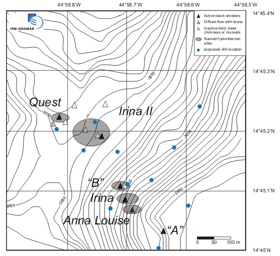 The overarching target of the project is the understanding of the three-dimensional spatial extent and the subseafloor variability of an ultramafic-hosted hydrothermal field. We used the video-guided mobile drilling platform Rockdrill 2 of the British Geological Survey in order to take drill cores (up to 15 m deep) from mineralized subseafloor rocks and massive sulfides from the Logatchev hydrothermal field at 14°45‘N on the Mid-Atlantic Ridge. Geochemical, mineralogical, and isotope studies of hydrothermal precipitates and mineralised rocks will help to understand the following scientific questions: