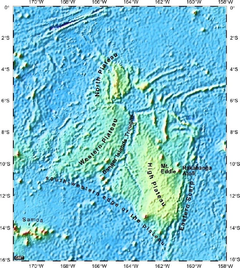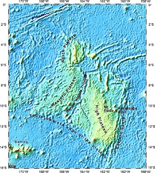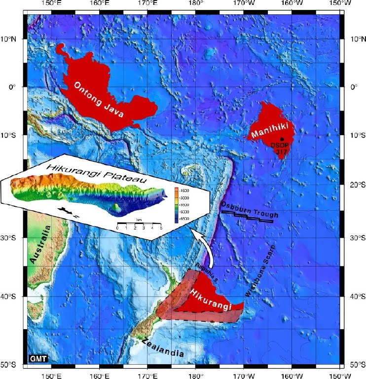 Three large oceanic plateaus being considered as Large Igneous province (LIPs) do exist in the SW-Pacific: The Manihiki Plateau (see below), the Ontong Java Plateau ~2,200 km to the west of the Manihiki Plateau covers 1.5 million square kilometers (approximately twice as large as Turkey) and is the largest LIP on earth, and the Hikurangi LIP ( 350,000 square kilometers, similar in size to Germany) approximately 3,000 km south of the Manihiki Plateau. According to some authors, the Manihiki Plateau may have formed during the same event which caused the formation of the Ontong Java Plateau („Greater Ontong Java Event“). Other studies suggest that the Manhiki Plateau may have once been connected to the Hikurangi Plateau. The inset shows a 3D-map of the NE edge (Rapuhia Scarp) of the Hikurangi Plateau which has been mapped and sampled on RV Sonne cruise SO168 ZEALANDIA. The Rapuhia Scarp rises up to 1,000 m above the Cretaceous Pacific abyssal plain and may represent a rifted margin. The Hikurangi Plateau may have been separated in the Cretaceous by seafloor spreading at the Osbourn Trough, a paleo-spreading center.