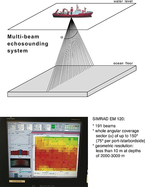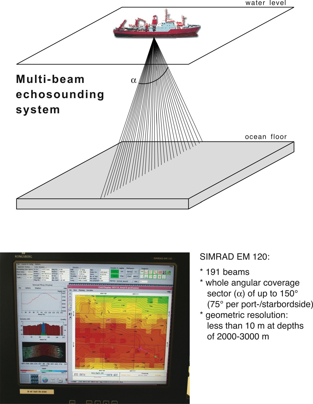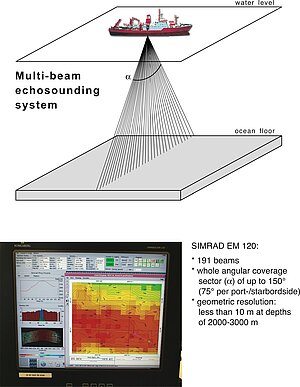 The sampling areas are pre-selected based on available bathymetric and literature data. Since these data in most cases were not adequate to find suitable sites for sampling, the seafloor was first mapped using a multi-beam echosounding system. By contrast to “normal” echosounding systems, which send one beam vertically beneath the vessel, multi-beam echosounding systems operate with many beams which map a swath beneath the vessel. The SIMRAD EM120 system of RV Sonne operates with 191 beams and is able to map a wide stripe of the seafloor below. The resulting data are immediately processed and are displayed onboard. However, bathymetric mapping is not only important for the identification of suitable sampling sites. Maps and 3D projections based on multi-beam data also provide important informations for various scientific investigations as examplified below.