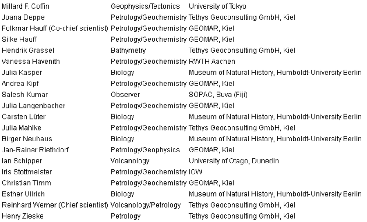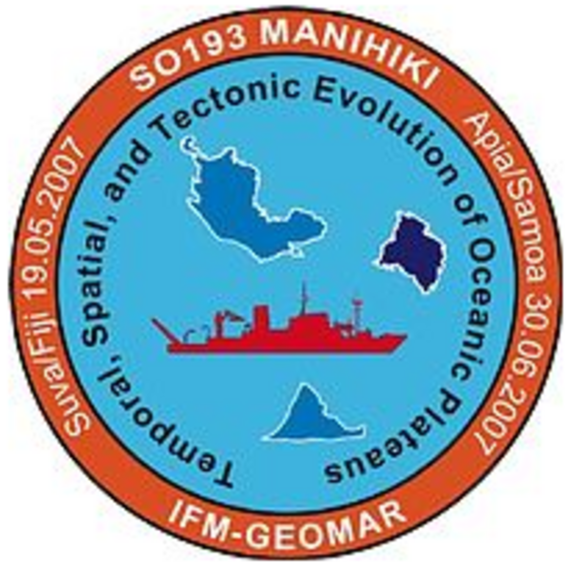 The research project MANIHIKI (“Temporal, spatial and tectonic evolution of oceanic plateaus”) began in May 2007 with an expedition of the German research vessel “Sonne” to the area of the Manihiki Plateau north-east of Samoa. The project was supported by the German Federal Ministry of Education and Research (BMBF) and comprises geological, geochemical, bathymetric, and biological investigations. The research cruise started on May 19th, 2007 in Suva (Fiji) and ended on June 20th, 2007 in Apia (Samoa), and was carried out by geoscientists from the Helmholtz Centre for Ocean Research in Kiel (formerly known as Leibniz Institute of Sciences), in cooperation with scientists from other institutes in Germany, New Zealand, an Japan. Analysis of rock samples, classification of marine fauna, interpretation of geochemical, age, and bathymetric data, and publication of results were completed within 2.5 years of the cruise.