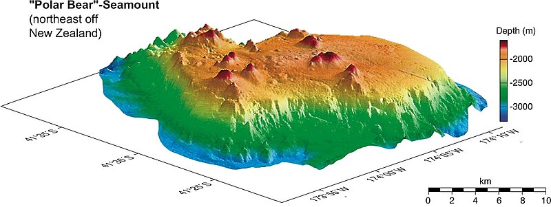 The figure to the left shows a seamount off New Zealand mapped on a prior RV Sonne expedition using the SIMRAD EM120 multi-beam echosounding system. The seamount is marked by a large plateau in its top area which has been formed by erosion at sea level (although now located in ~2,000 m water depth). This observation is consistent with the seamount being a former island volcano that was eroded to sea level after the volcanic activity ceased and afterwards subsided by ~2,000 m. Many relatively small volcanic cones are located on the erosional plateau. These volcanoes must have formed after erosion of the former island and subsidence below sea level since they are obviously not eroded. In summary, mapping of this seamount provided important informations on its evolution as, for example, that the seamount has been a former island volcano and that at least to stages of volcanic activity occured at different times („shield stage“ and „post-erosional-stage“).