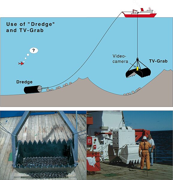 The schematic sketch illustrates methods for sampling magmatic rocks on the ocean floor. Dredges are similar to large steel buckets or frames with steel teeth at their openings, which are dragged along the ocean floor and thereby scraping off rocks the ocean floor into the dredge (see left). We use dredges to sample submarine volcanic structures. The TV grab consists essentially of a set of steel jaws with a video camera in the center, which transmits pictures of the ocean floor. When scientists identify a suitable object for sampling on the monitor, they can close the hydraulic jaws by remote control around the object and then heave it on board. The TV grab is more suitable for selective sampling of loose or soft rocks or even zoological material, whereas dredging can break off rocks from the basement and usually recovers a larger amount of sample material. For biological sampling a „multi corer“ will be deployed which allows sampling of undisturbed sediments from the surface of the ocean floor. When the multi corer touches the ocean floor, a weight presses some tubes up to ~40 cm deep into the sediment. As soon as the tubes have pentrated the sediment their lower openings will be closed. Afterwards the multi corer will be hieved on board and the „blanked“, undisturbed sediment cores can be drawn from the tubes.