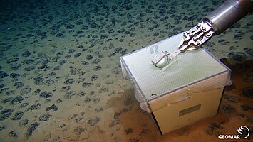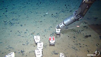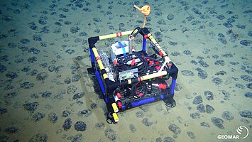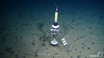 The objective of the first leg was the investigation of the status quo conditions (abiotic and biotic) in the CCFZ, an area proposed for mining of manganese nodules. The main objective during the second leg was the monitoring of the first trials of a so-called nodule collector under in-situ conditions, to be able to assess and possible effects on the entire ecosystem. To evaluate the effect of the expected sediment cloud, a sensor array was deployed on the sea floor (see images). Due to technical problems, the collector could not be deployed. Instead a dredge experiment was conducted to simulate the sediment cloud.