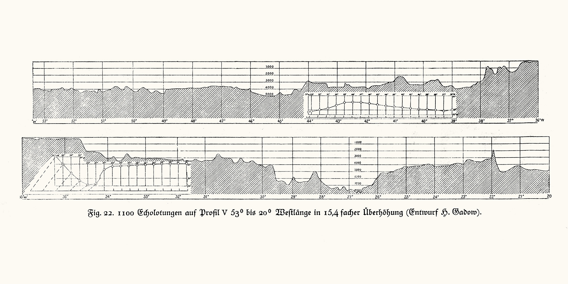 18.10.25: „Morgens finden wir mit Echolot eine Bank, wir machen auf 800 m Lotung u. Station 65. Danach wird die Bank, die wir „Meteorbank“ oder „Meteorschwelle“ taufen wollen in sinniger Anlehnung an die gestrige Bouvet Schwelle (Getauft Meteor – Bouvet 1870). Wir loten die Bank ab, sie ist ein vollkommener Kegel, der bis zu 590 m aufsteigt.“