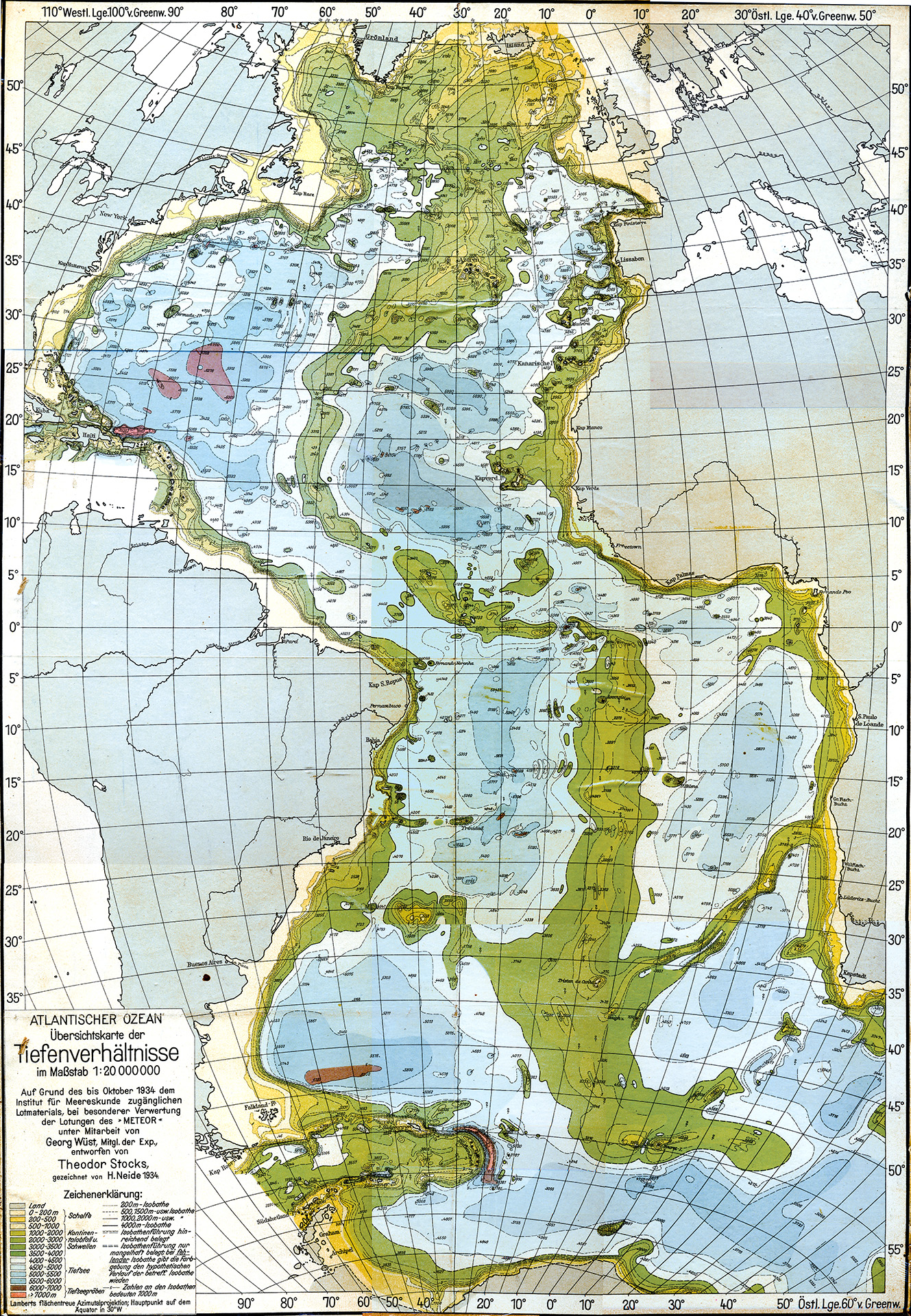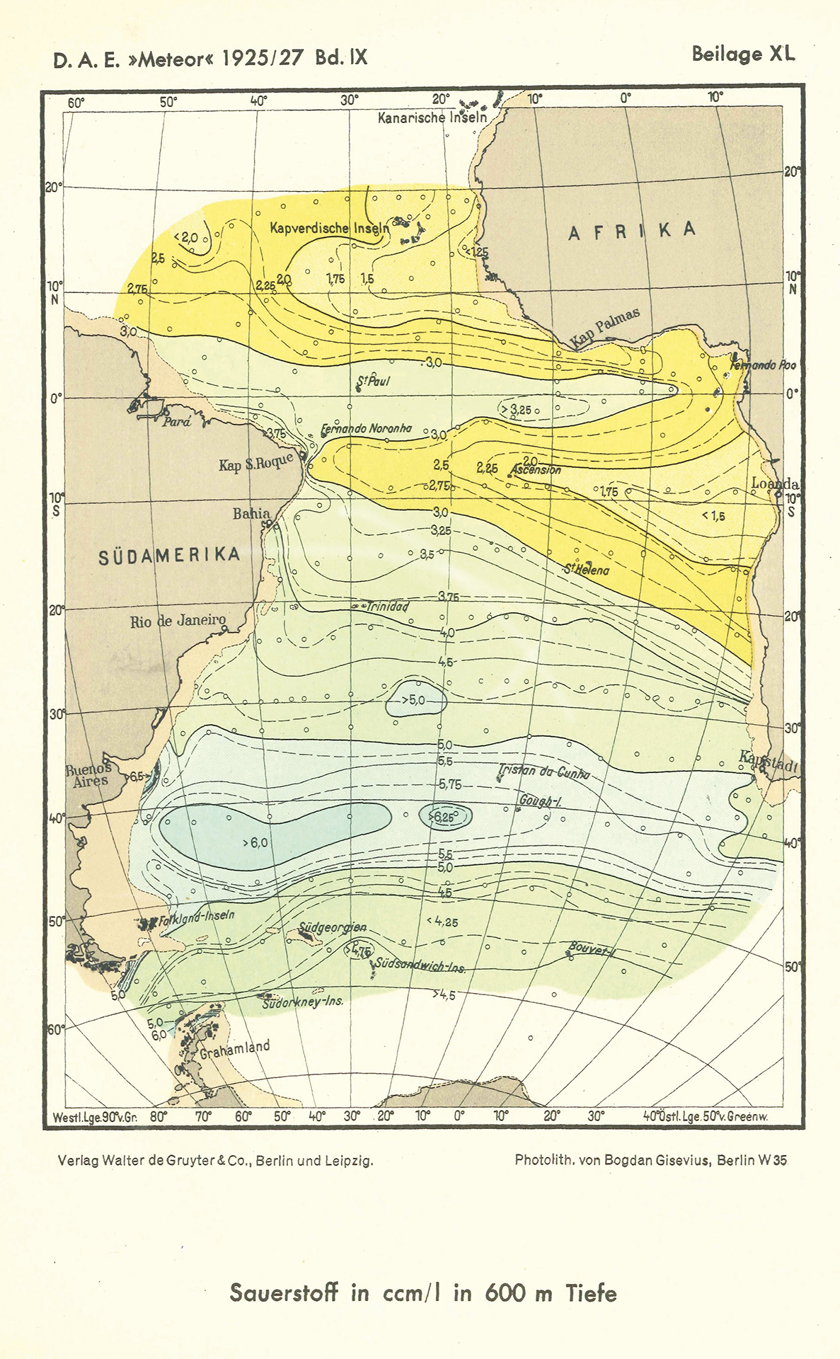 „Auf der geographischen Länge der Bouvet-Insel wurde eine auf 1500 m ansteigende Schwelle festgestellt, deren Zusammenhang mit dem Bouvetsockel noch auf Profil V näher untersucht werden soll, und östlich davon wurde in 4S0 16'S und 8°14'O eine in sich abgeschlossene Bank gefunden und planmäßig abgelotet. Es handelt sich um eine aus 3000 m Tiefe aufsteigende in südwest-nordöstlicher Richtung verlaufende Bank mit einer geringsten Tiefe von 560 m. Sie ist anscheinend nicht vulkanischer Natur. Ihr wurde der Name „Meteorbank" gegeben.“