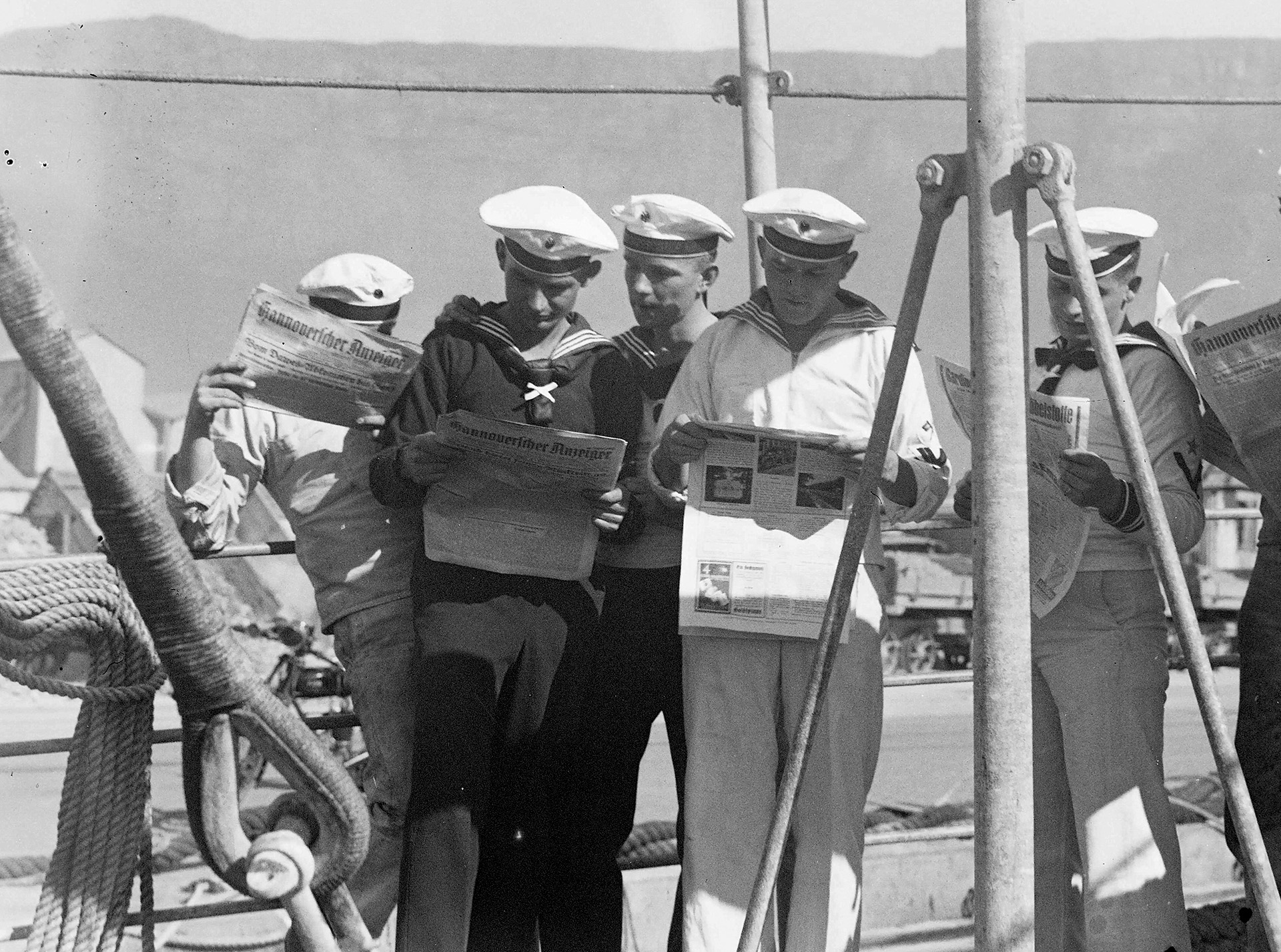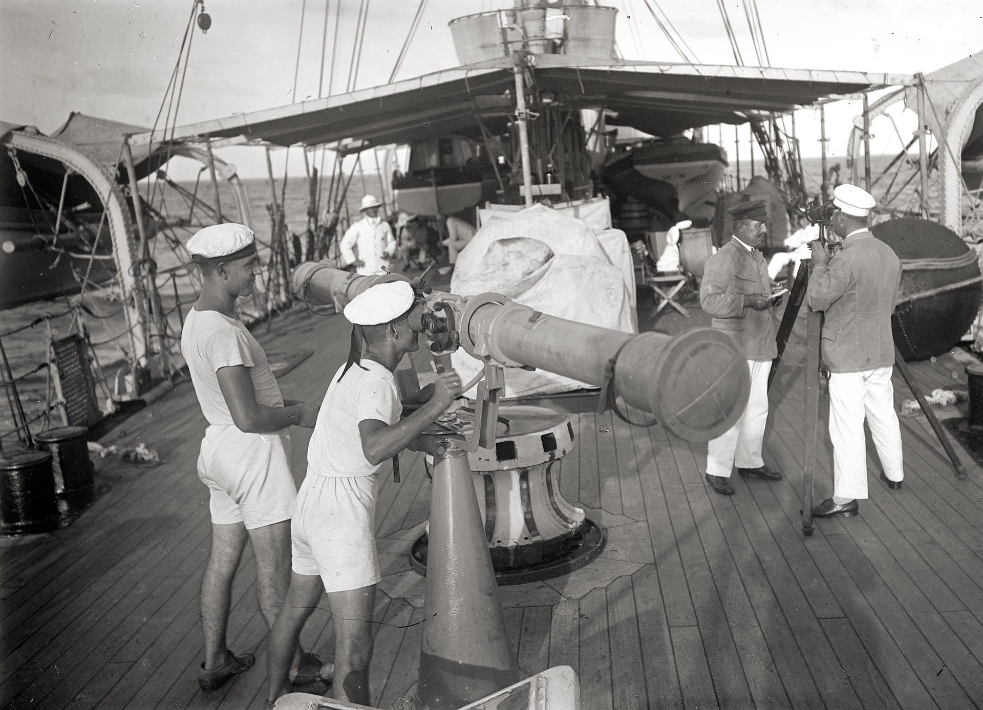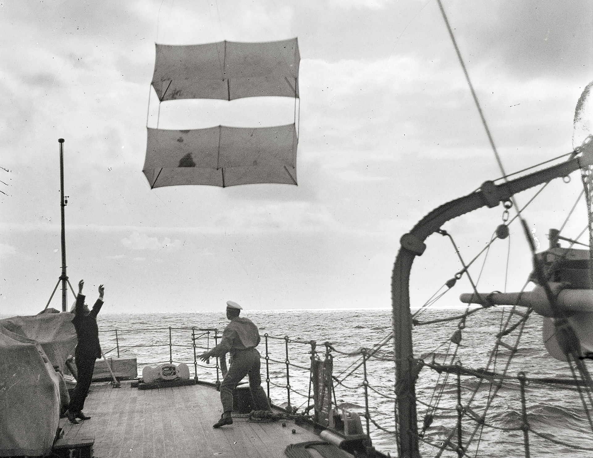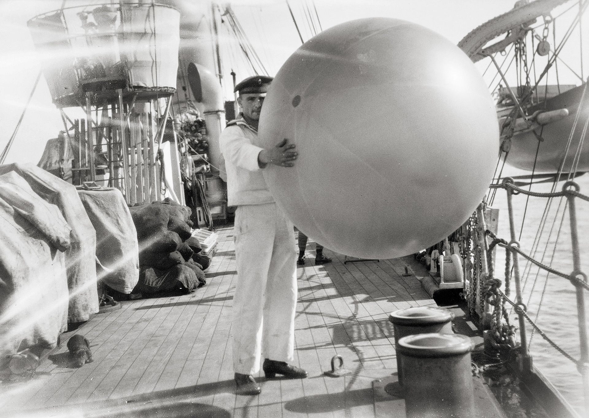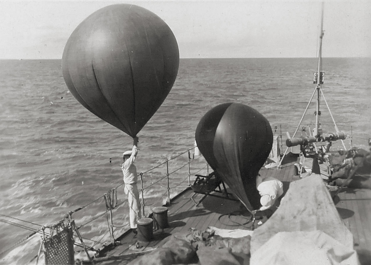 03.02.27: „Wir machen Registrierballonaufstieg. Der erste Ballon platzt vorzeitig schon nach etwa 20 Min in etwa 5000m Höhe. Der Signalballon wird dauernd verfolgt u. gepeilt, platzt aber auch vorzeitig, sodaß wir nach 3/4 Stunden mit Alle Fahrt laufen müssen, um an die Stelle zu kommen, wo Hülle u. Instrument im Wasser treiben. Wir bekommen es auf den Kopf etwas später als die geschätzte Zeit u. der Signalgast Spiekermann im Vortopp erhält die 10 R.M. Belohnung ausgerechnet an seinem Geburtstag. Die Meteorologen führen das Vorzeitige Platzen des Ballons auf die große Hitze zurück, infolge deren die Ballons sich zu schnell ausdehnen. Immerhin hat das Instrument eine Höhe von 4780m erreicht.“