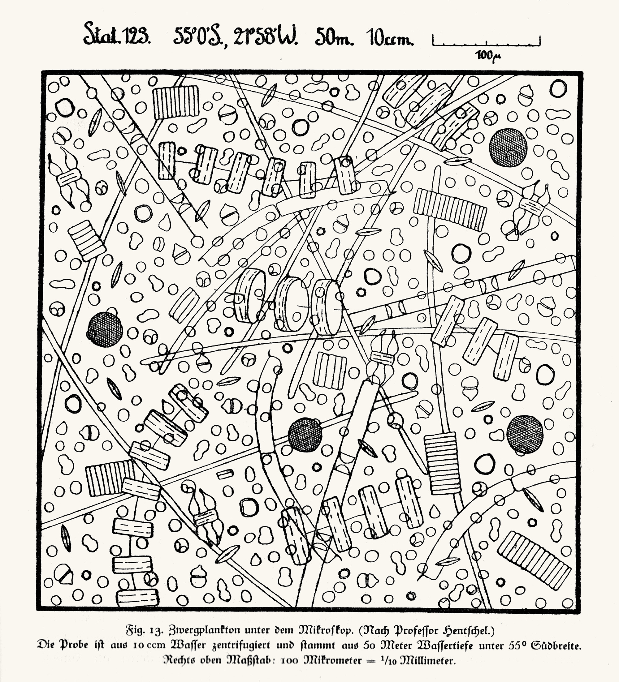 „Die lichtlose Tiefsee war zum Beginn unserer Expedition für die quantitative Planktonforschung im vollen Sinne des Wortes mare incognitum. Wir haben nun festgestellt, daß im Bereich unserer drei ersten Profile das Wasser in allen Tiefen noch so dicht mit Nannoplankton bevölkert ist, daß in wenig mehr als einem halben Liter (540 cem) Wasser fast ausnahmslos noch einige Organismen zu finden sind. Dies Tiefenplankton stellt sich nicht nur als ein verarmtes Oberschichtenplankton dar, sondern ist einigermaßen charakteristisch...“