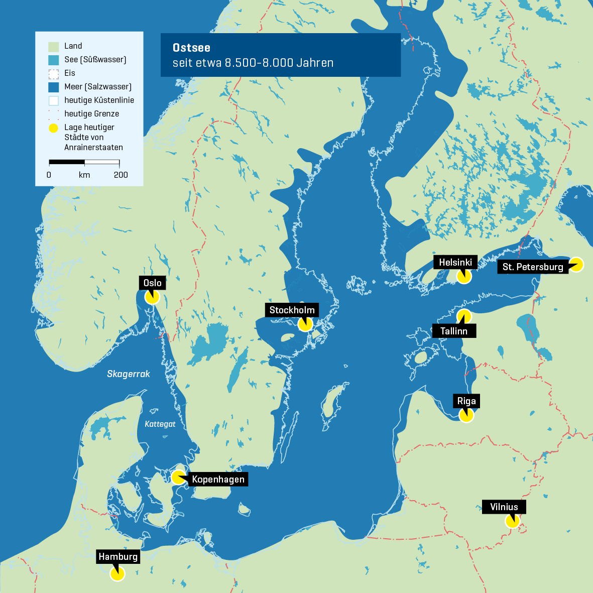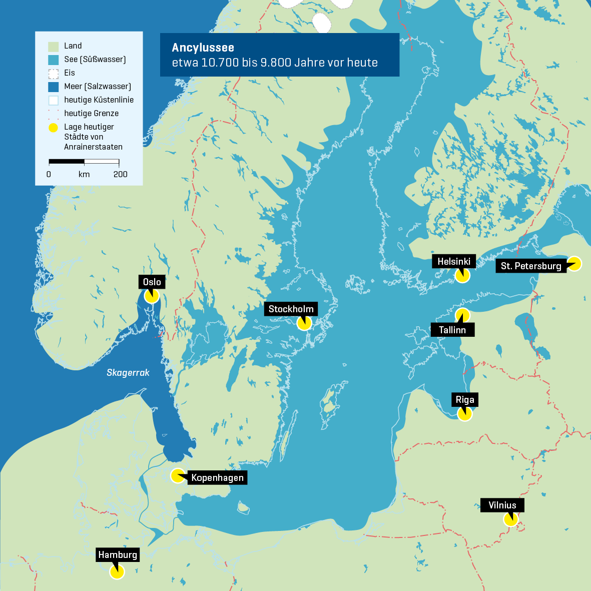 Doch dieser frühen „Ostsee“ war nur eine kurze Zeit vergönnt. Mit dem nun auf der ganzen Nordhalbkugel rasch abschmelzenden Eis stieg zwar der weltweite Meeresspiegel, doch hob sich auch das vom Gewicht des Eises befreite Mittelschweden. Vor ca. 10.700 Jahren schloss sich die Verbindung zum Skagerrak weitgehend und es bildete sich der „Ancylus-See“, ein Süßwassersee, der zeitweise eine noch größere Fläche als die heutige Ostsee einnahm. Allein die Gebiete der heutigen dänischen, deutschen und polnischen Ostseeküsten lagen trocken und verhinderten einen südlichen Abfluss des Süßwassers zur Nordsee. Mit dem weiter steigenden weltweiten Meeresspiegel war aber auch die zweite Süßwasserphase bald vorüber. Unaufhörlich drang Salzwasser durch das Kattegatt nach Süden vor. Es schuf sich schließlich durch den Öresund sowie den Großen und Kleinen Belt drei Verbindungswege zum Ancylus-See, in den vor ca. 8.500-8.000 Jahren das Salzwasser in breiter Front eindringen konnte. Damit wurde die wechselvolle Süß- und Salzwasser-Geschichte dieses Schelfmeeres vorerst beendet und es entstand die Brackwasser-dominierte Ostsee, wie wir sie heute kennen.