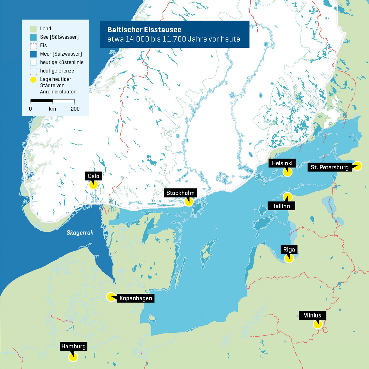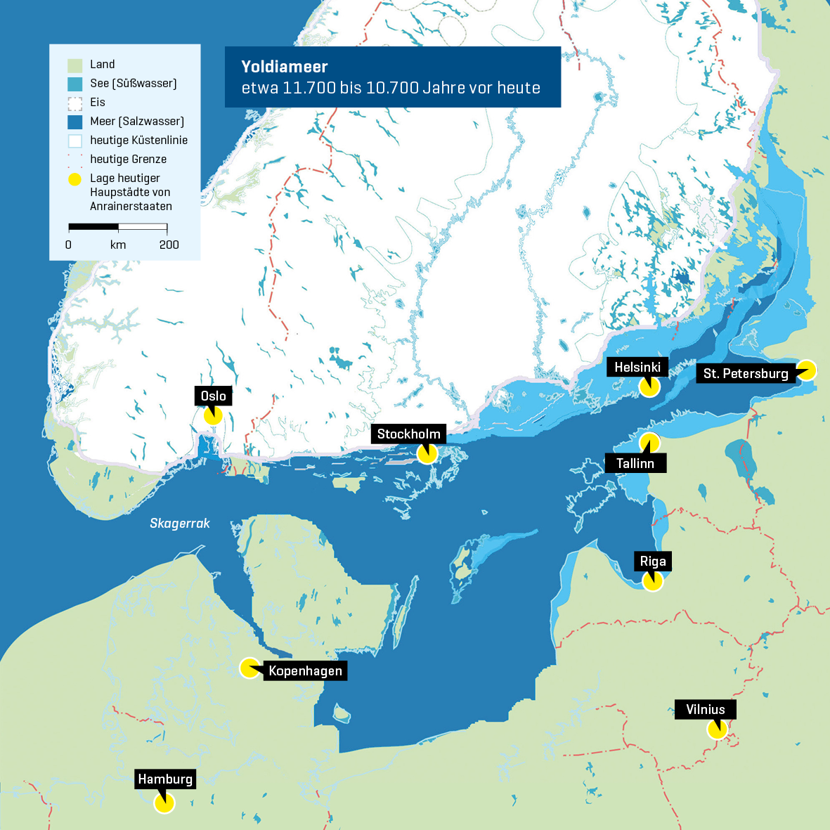 Die Geschichte der Ostsee beginnt mit dem Ende der Eiszeit. Durch das sich langsam erwärmende Klima schmolz das skandinavische Eis allmählich. Vor ca. 14.000-12.000 Jahren bildete sich so im Ostseebecken ein riesiger Schmelzwassersee. Das Eis schmolz weiter und wie eine Badewanne füllte sich das Ostsee-Becken, bis es schließlich vor etwa 11.700 Jahren in einem katastrophenartigen Ereignis überlief. Riesige Mengen von Süßwasser ergossen sich durch Mittelschweden direkt in den Skagerrak, während Südschweden und die dänischen Inseln über eine Landbrücke mit Schleswig-Holstein verbunden blieben. Der Seespiegel senkte sich um rund 25 Meter, bis der Süßwasserausstrom schließlich zum Stillstand kam. Durch den entstandenen mittelschwedischen Verbindungskanal konnte nun auch Salzwasser in den Ostseebereich einfließen. So existierte dort vor ca. 11.000 Jahren das „Yoldia-Meer“, das nach einer damals dort lebenden Brackwasser-Muschel benannt ist und sich bis Südfinnland erstreckte.