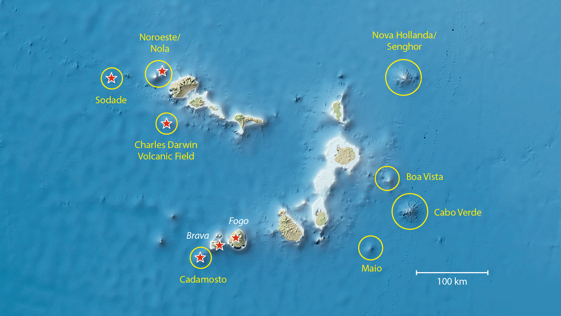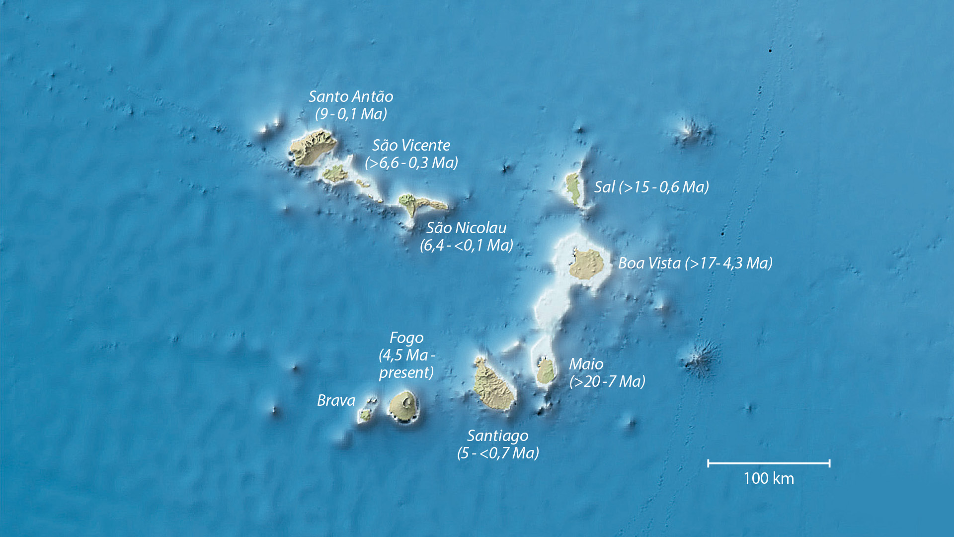 Das Archipel der Kapverden besteht aus Inseln und Tiefseebergen (sogenannte Seamounts) vulkanischen Ursprungs. Der Vulkanismus wird durch einen sogenannten Hot Spot verursacht: Heißes verformbares Gestein im tiefen Erdinneren steigt langsam auf und bildet heißes Magma, das die dünne Ozeanplatte immer wieder durchdringt. Dabei wölbt sich auch der Meeresboden der Region auf.
