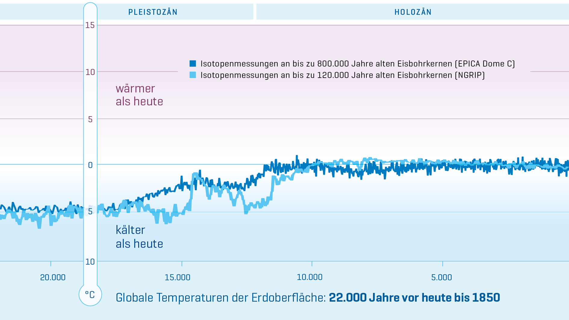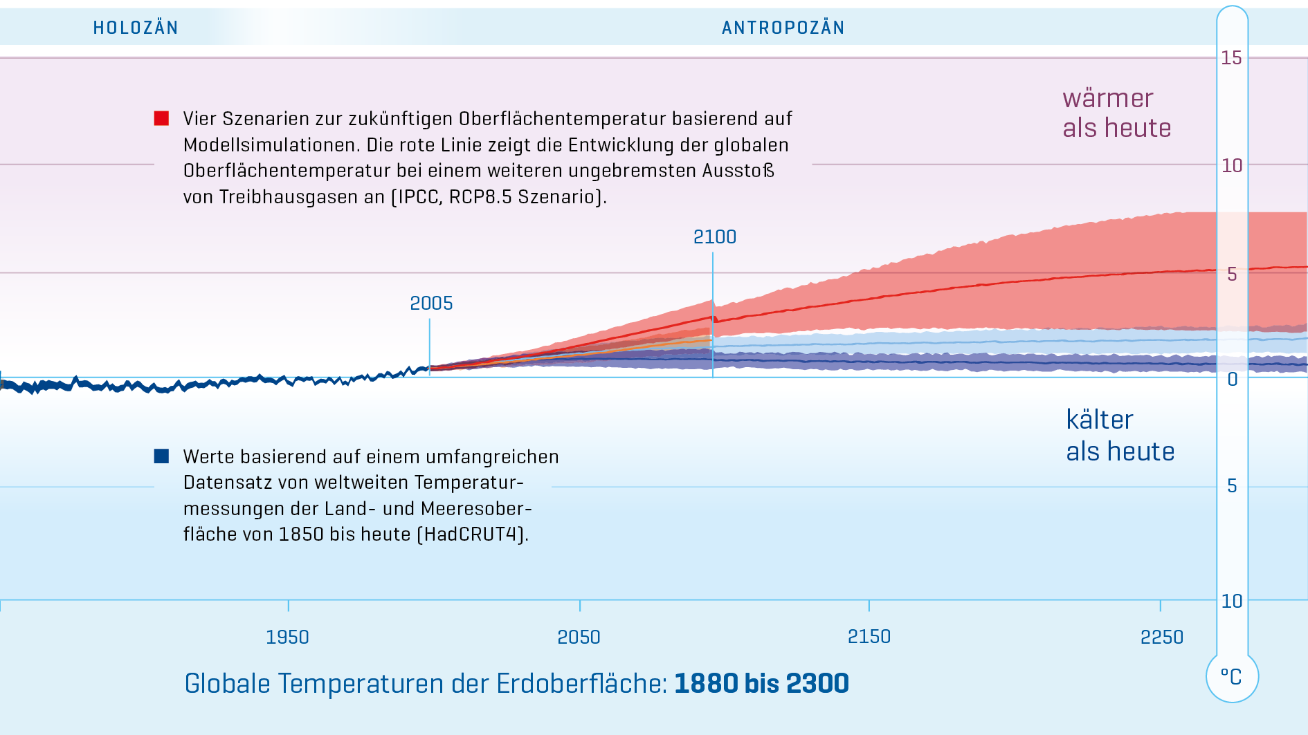 Die Zeitspanne der oberen Grafik beginnt am Ende der Kreidezeit und umfasst die gesamte Erdneuzeit bis hinein in die nahe Zukunft auf verschiedenen Zeitskalen. Die farbigen Linien der Temperaturwerte wurden aus natürlichen Klimaarchiven, Ozeanbeobachtungen und Modellsimulationen ermittelt. Die Oberflächentemperatur ist als Differenz zum Durchschnitt des Zeitraums von 1960-1990 aufgetragen. Die global gemittelte Temperatur in diesem Zeitraum lag bei 14° Celsius.