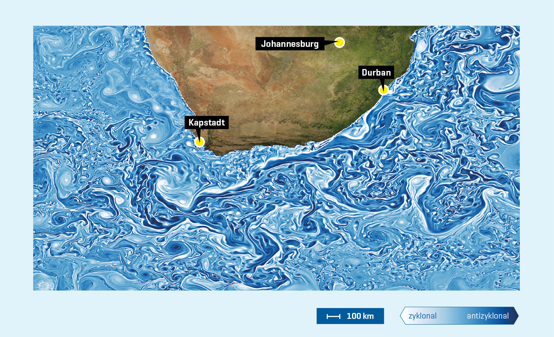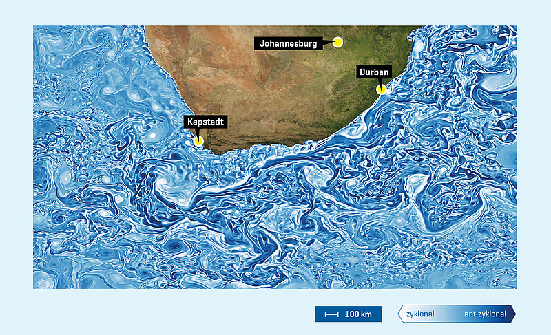 Ein Paradebeispiel ist die Simulation der Ausbreitungspfade der globalen Umwälzzirkulation. Trotz einer wachsenden Zahl an Ozeanbeobachtungen gibt es bisher nicht genügend Daten, um die Gesamtheit des Strömungssystems abzubilden. Ozeanmodelle können hier helfen, allerdings kommt es dabei auf die räumliche Auflösung der Modelle an, da Teile der großskaligen Umwälzzirkulation von kleinerskaligen Prozessen beeinflusst werden. Zum Beispiel wird der Wassertransport aus dem Indischen Ozean in den Atlantik in Modellen ohne mesoskalige Wirbel (10-100 km) überschätzt. Da Wasser aus dem Indischen Ozean im Allgemeinen wärmer und salzreicher ist als das aus dem Pazifik, beeinflusst das Verhältnis beider Wassertransporte die Temperatur und den Salzgehalt im Südatlantik und damit potenziell auch die Stärke und Stabilität der gesamten Umwälzbewegung. Die Variabilität der Wassertransporte aus dem Indischen Ozean und dem Pazifik sowie der Einfluss von Vermischungsprozessen sind daher Gegenstand aktueller Forschung.