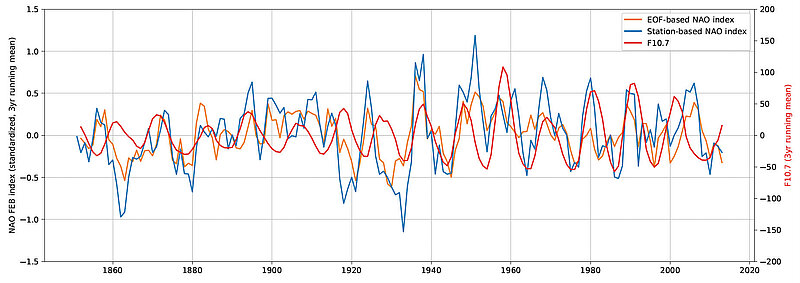 Die sogenannte Nordatlantische Oszillation (NAO) ist eines der wichtigsten Zirkulationsmuster auf der Nordhalbkugel mit direktem Einfluss auf Wetter und Klima in Europa. Wissenschaftler:innen des GEOMAR und anderer internationaler Einrichtungen konnten nachweisen, dass die NAO vom natürlichen, elfjährigen Zyklus der Sonnenaktivität beeinflusst wird. Für die Untersuchungen wurde ein Klimamodell benutzt, welches den Ozean und die Atmosphäre beinhaltet. Zusätzlich verfügte dieses Modell noch über eine detaillierte Atmosphärenchemie, welche die Wirkung von Variationen der ultravioletten Strahlung mit dem Sonnenfleckenzyklus in höheren Schichten der Atmosphäre besonders gut berücksichtigen konnte. Diese zusätzliche Komponente war der Schlüssel, um die Schwankungen in der solaren Einstrahlung über komplexe Wirkungsmechanismen aus der Stratosphäre in 10 bis 50 Kilometern Höhe in die untere Atmosphäre zu übertragen. Dazu wurden Experimente mit und ohne den Einfluss des elfjährigen Sonnenzyklus durchgeführt.