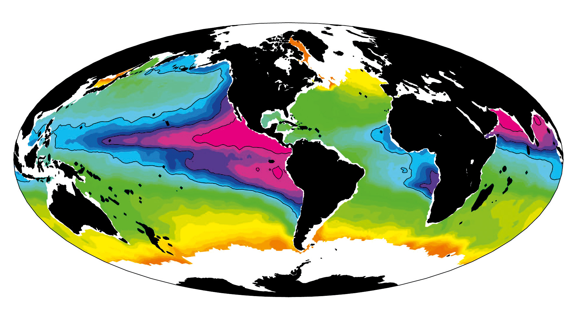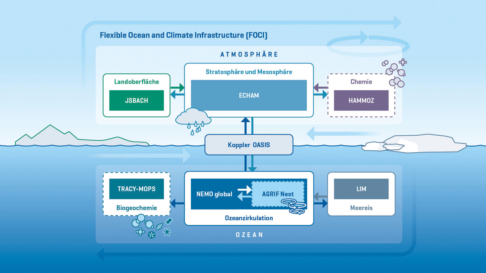 Wechselwirkungen im Klimasystem verursachen natürliche Klimaschwankungen, die sich über Zeiträume von Monaten bis Jahrhunderten abspielen. Modellstudien helfen den Forscher:innen dabei, diese natürlichen Klimaschwankungen besser zu verstehen und verlässlichere Abschätzungen über die zukünftige Entwicklung des Klimas zu geben. Zu einem Klimamodell gehören deswegen heute neben einer atmosphärischen und ozeanischen Komponente auch Meereis- und biogeochemische Komponenten, die interaktiv gekoppelt sind. Mit dem neuen flexiblen Kieler Klimamodellsystem FOCI kann die Auflösung in bestimmten Ozeanregionen wie dem Golfstromsystem im Nordatlantik oder dem Agulhasstromsystem im Bereich zwischen Südatlantik und Indischem Ozean erhöht werden, um den Einfluss der Ozeanwirbel auf großräumige Zirkulationsmuster in Atmosphäre und Ozean zu untersuchen. Simulationen mit diesen komplexen Modellen sind so aufwendig, dass sie nur auf den leistungsfähigsten Großrechnern möglich sind. Die Entwicklung dieser Modelle erfordert auch viel Kompetenz und Erfahrung. So wurde das Klimamodellsystem FOCI gemeinsam von den GEOMAR-Forschungseinheiten Maritime Meteorologie und Ozeandynamik mit nationalen und internationalen Partnern, wie zum Beispiel dem Max-Planck-Institut für Meteorologie in Hamburg oder dem europäischen NEMO-Konsortium aufgebaut.