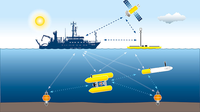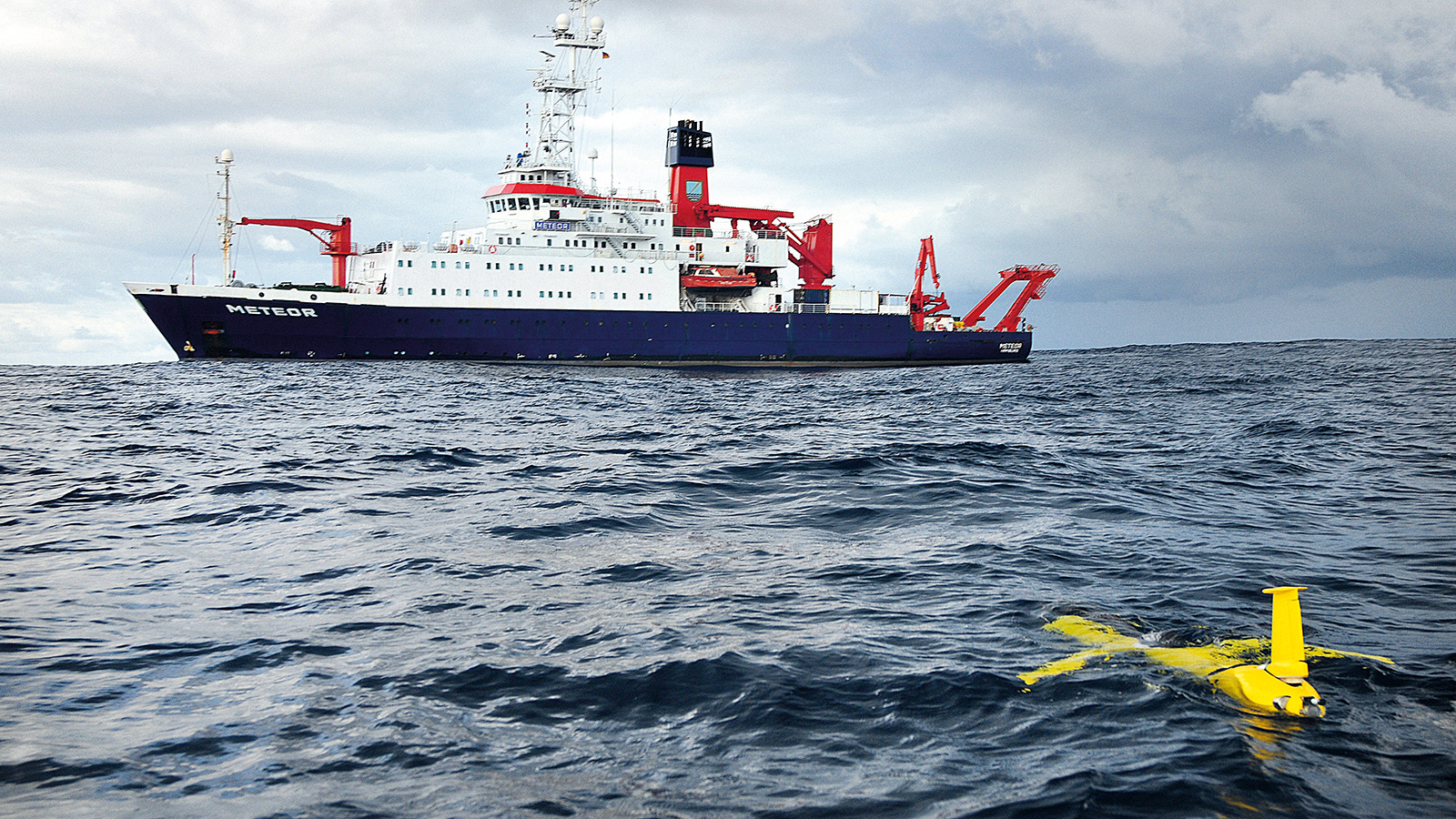 Seit Mitte der 2000er Jahre werden außerdem Unterwassergleiter eingesetzt. Diese autonomen Tauchroboter haben den Aktionsradius enorm vergrößert: Die Tiefendrifter erhielten quasi ‚Flügel‘ und kommen so zusätzlich in die Vorwärtsbewegung. In kleinen Schwärmen ermöglichen sie eine feinmaschige Ozeanvermessung, so können Wassermassen verfolgt und analysiert, Ozeanwirbel sichtbar gemacht und Strömungen vermessen werden. Foto: Michael Schneider, FS METEOR